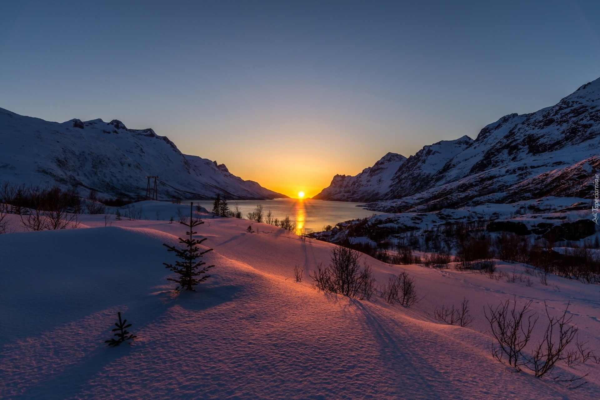 Edytor tapety: Zima, Góry, Jezioro, Drzewa, Świt