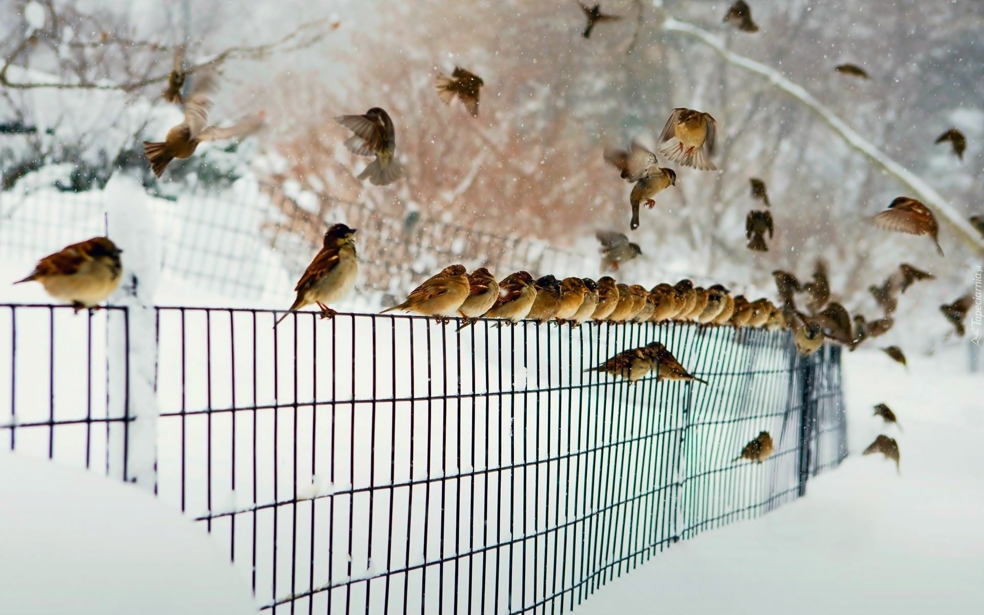 Edytor tapety: Wróbelki, Ogrodzenie, Ścieżka, Drzewa, Zima