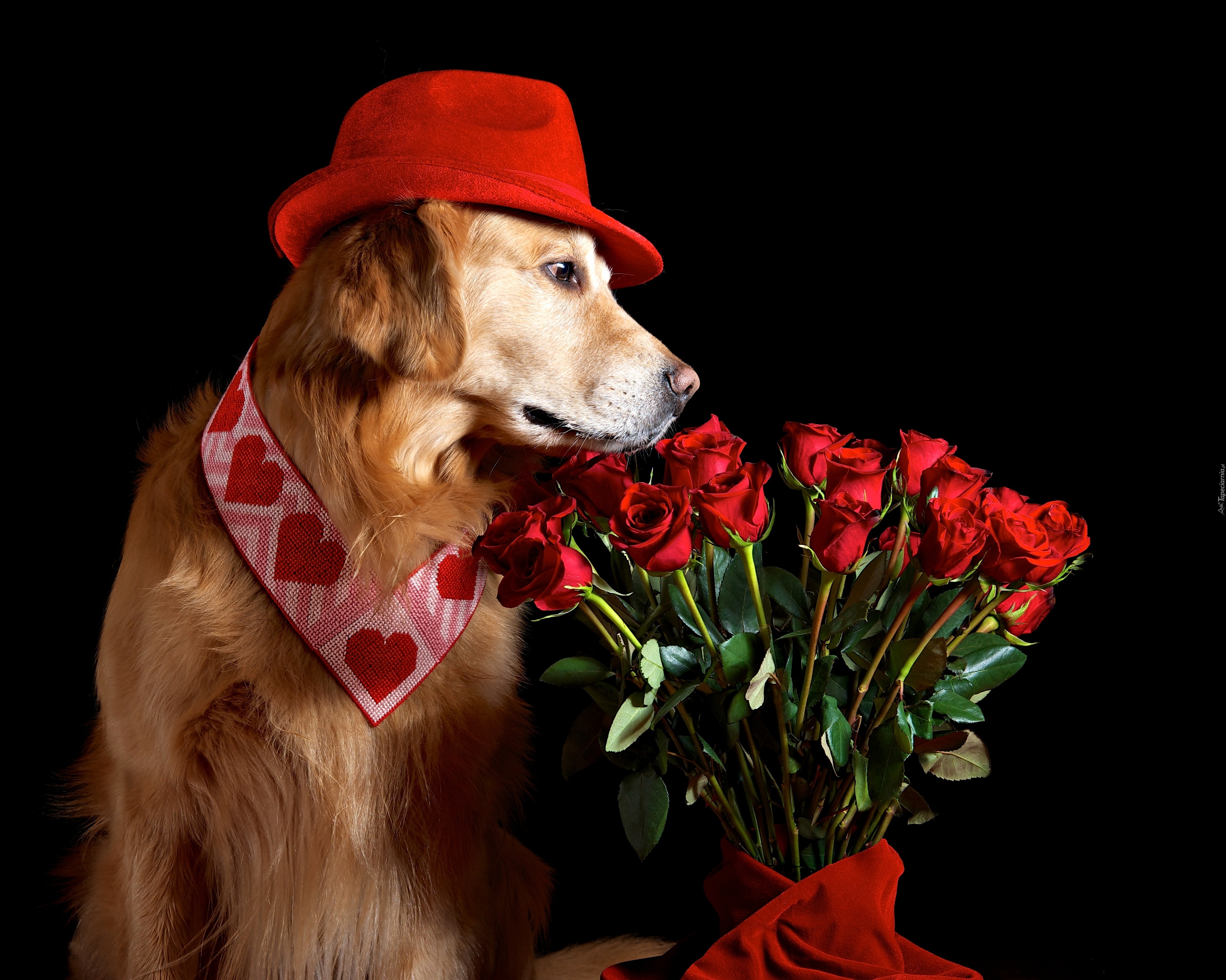 Edytor tapety: Pies, Golden retriever, Kapelusz, Bukiet, Róże