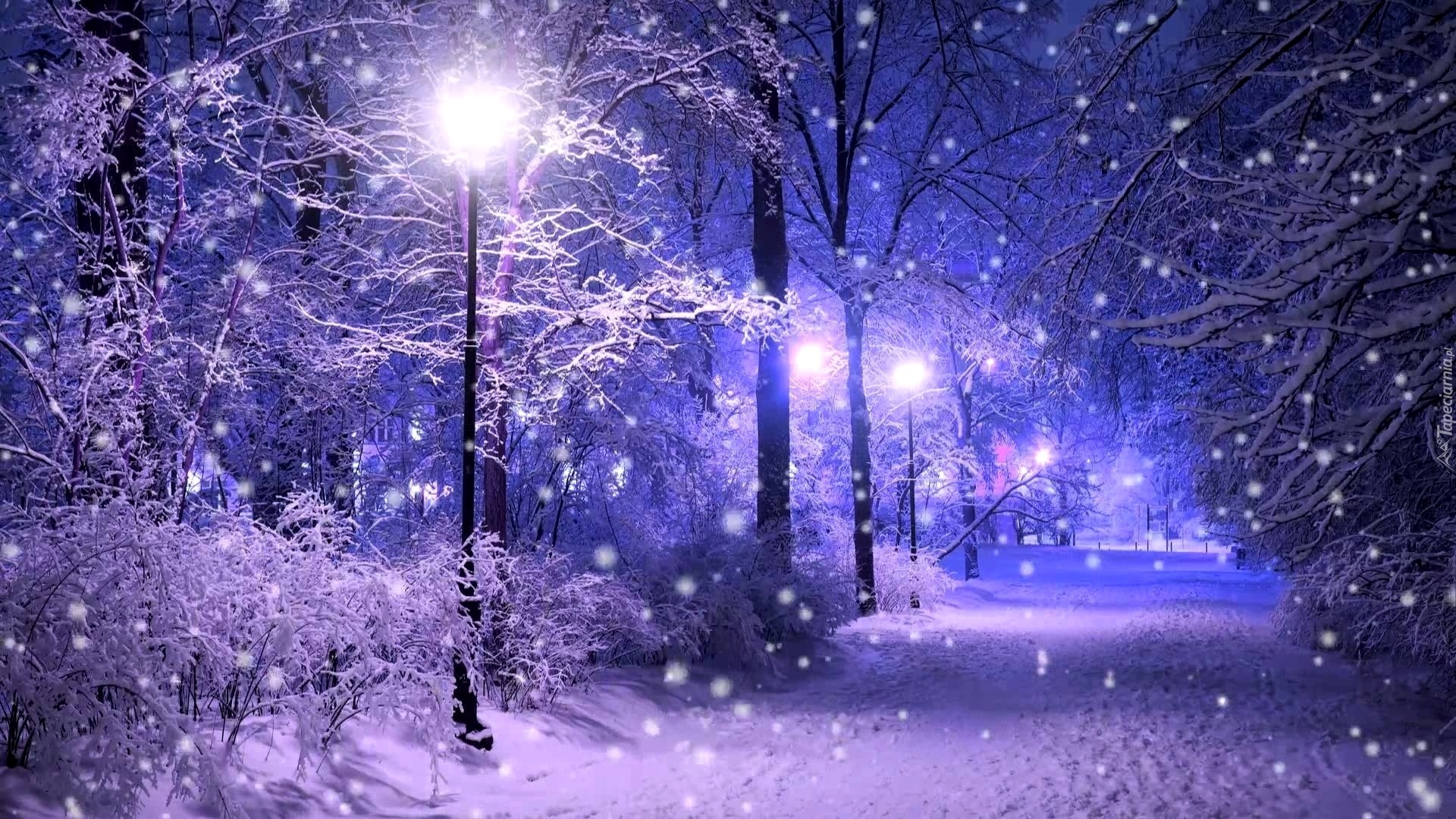 Edytor tapety: Zima, Park, Noc, Latarnie, Śnieg