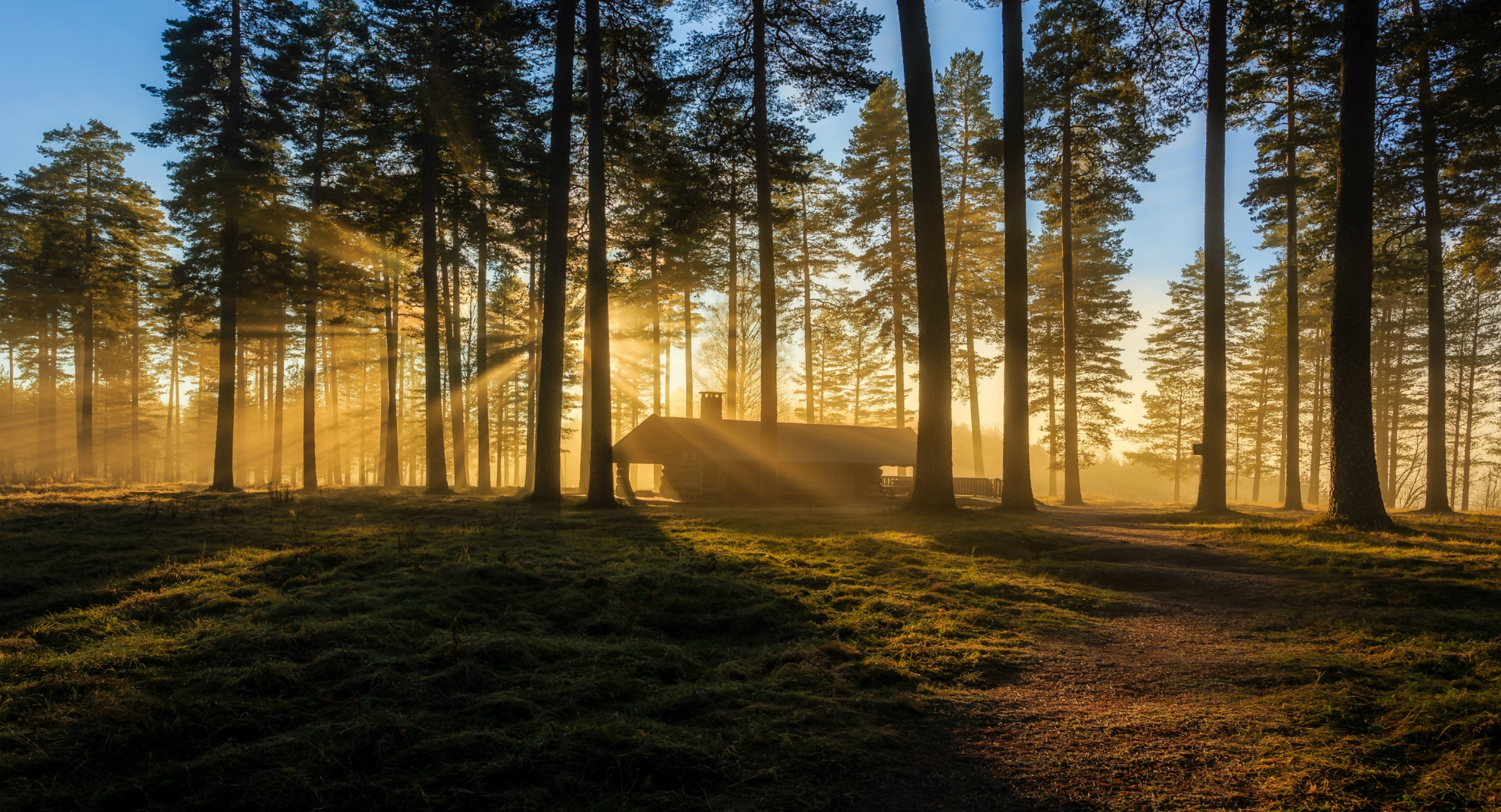 Edytor tapety: Domek, Las, Drzewa, Przebijające Światło
