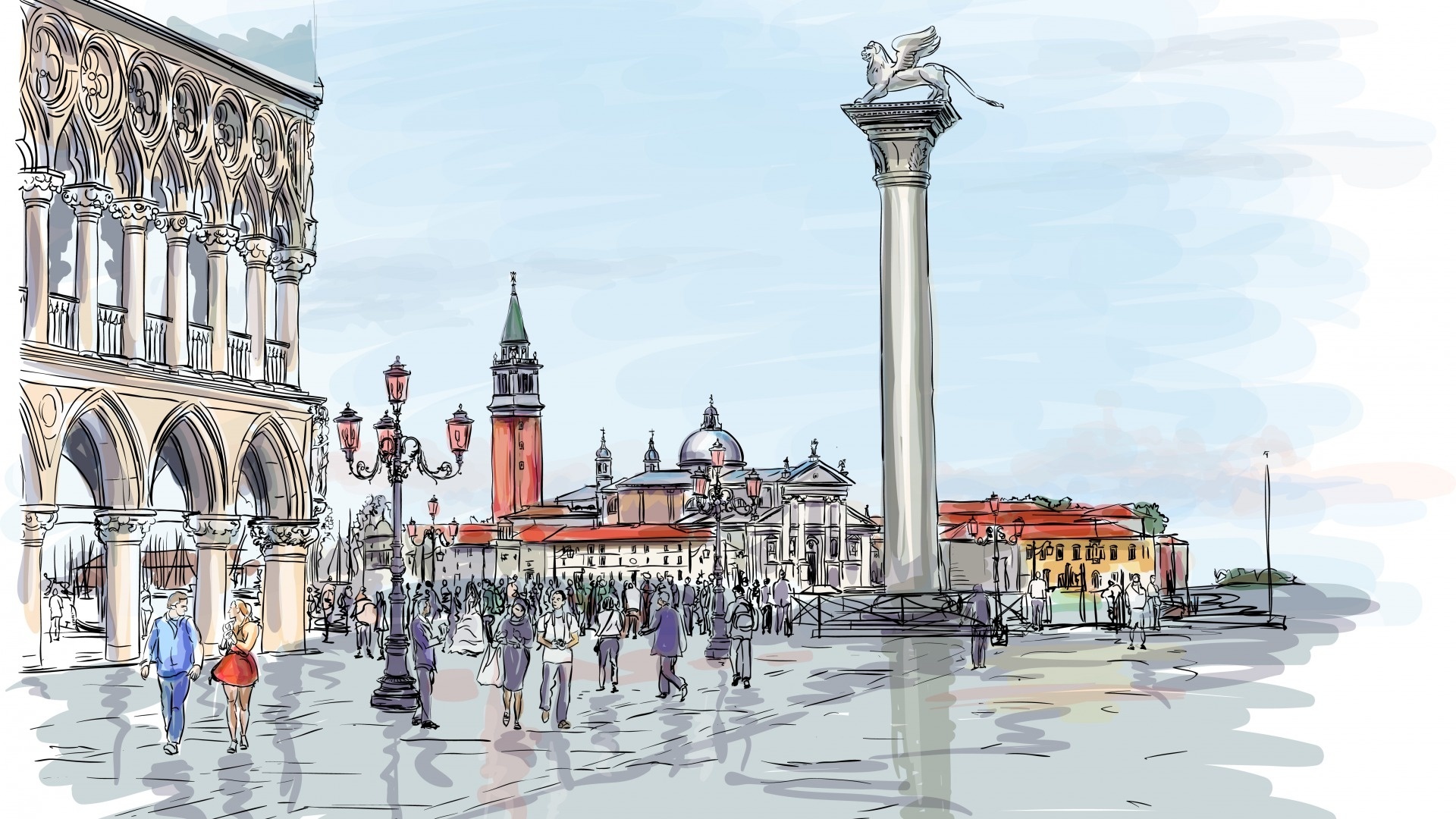 Edytor tapety: Rysunek, Włochy, Wenecja, Zabytki, Domy, Ludzie