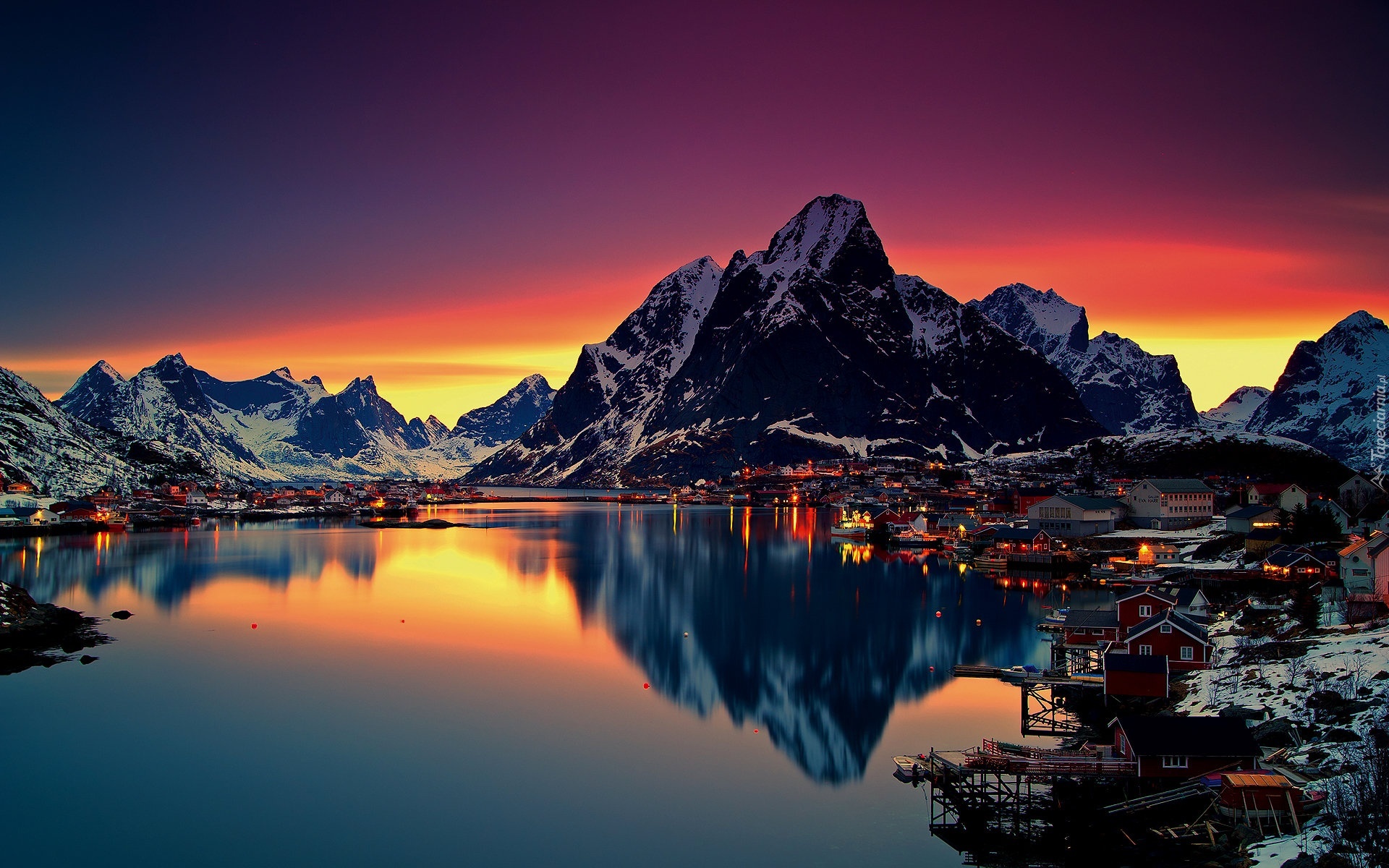 Edytor tapety: Miasteczko, Wybrzeże, Zachód Słońca, Zima, Góry