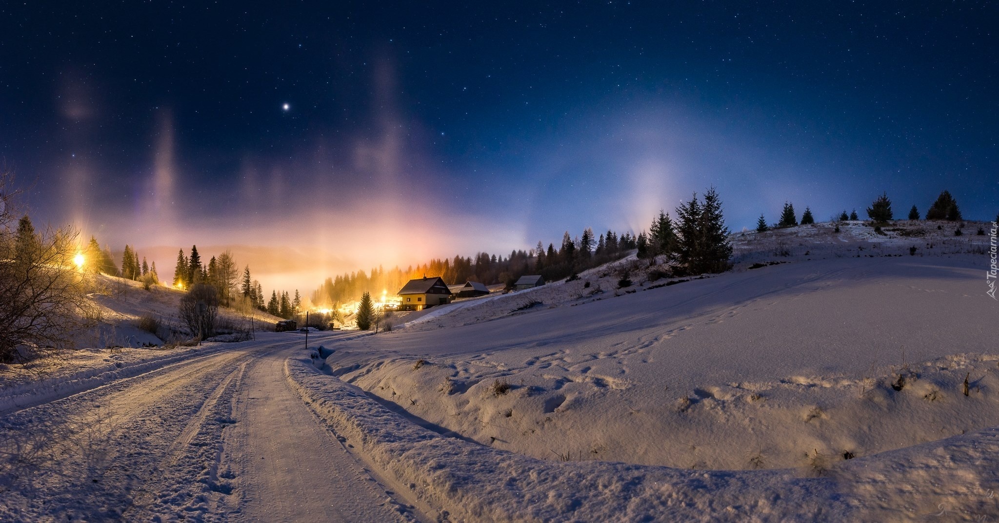 Edytor tapety: Śnieg, Noc, Poświata, Droga