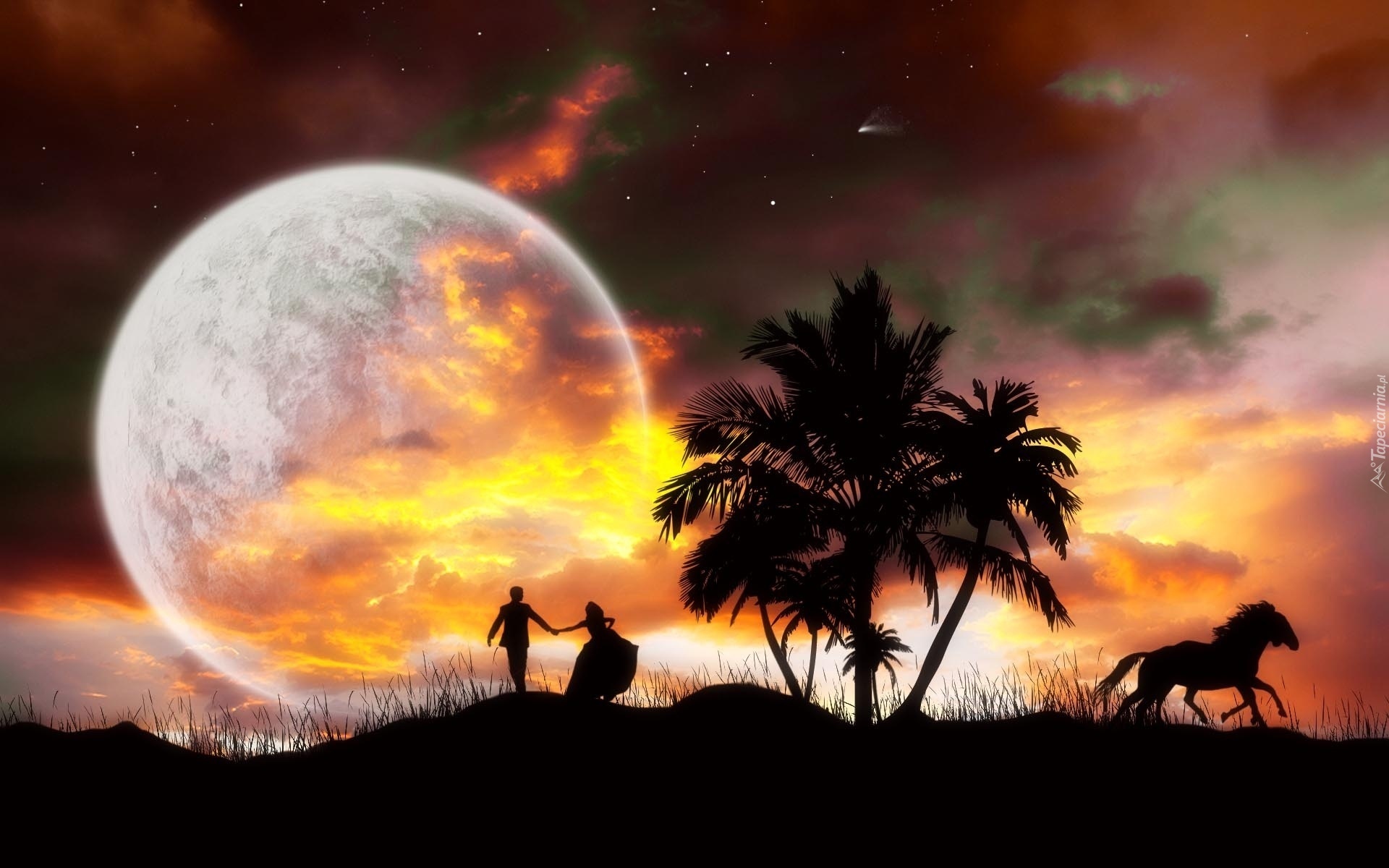 Edytor tapety: Księżyc, Drzewo, Konie, Dziewczyna, Chłopak, Niebo