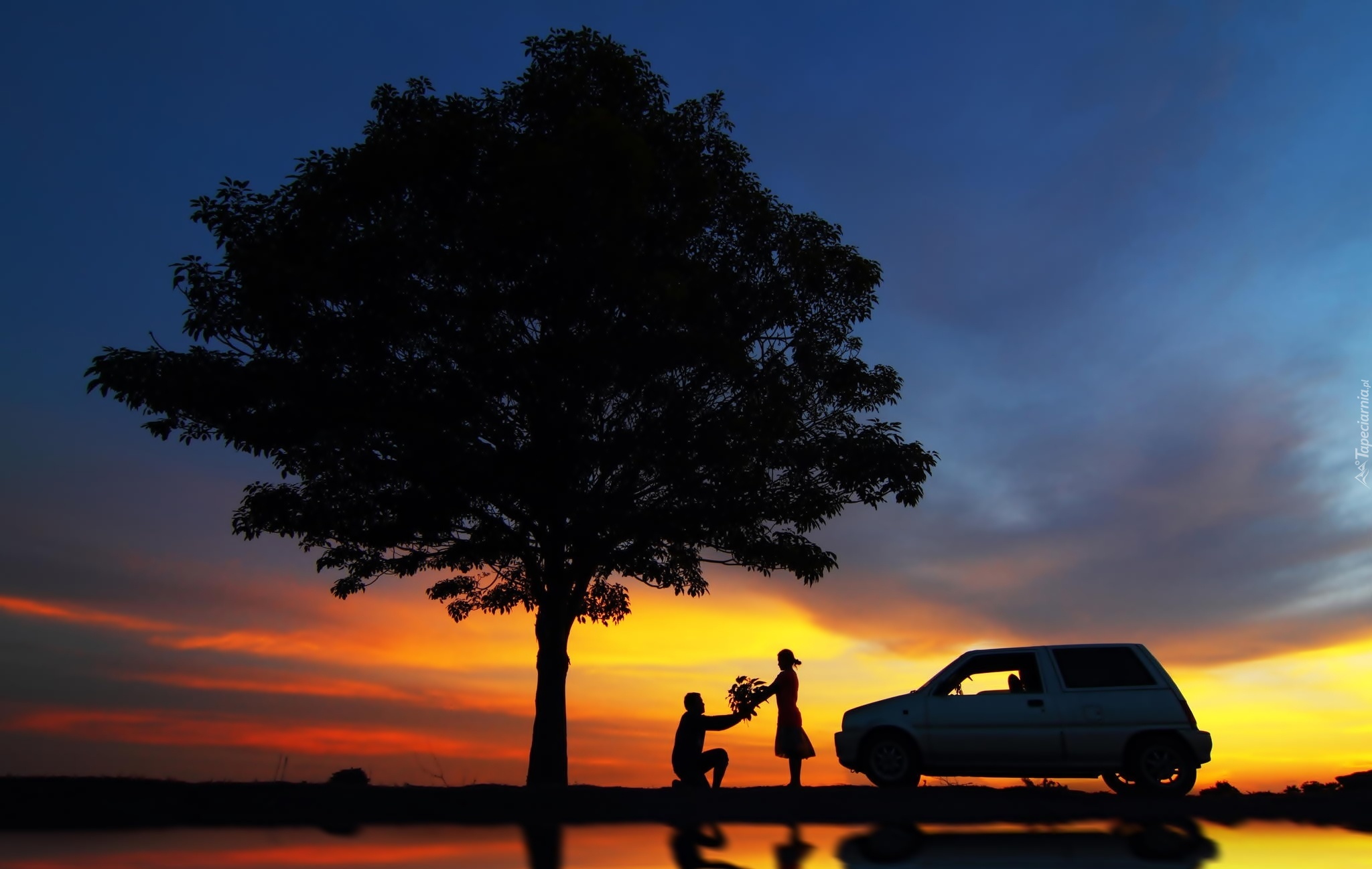 Edytor tapety: Para, Kwiaty, Walentynki, Drzewo, Samochód, Zachód Słońca