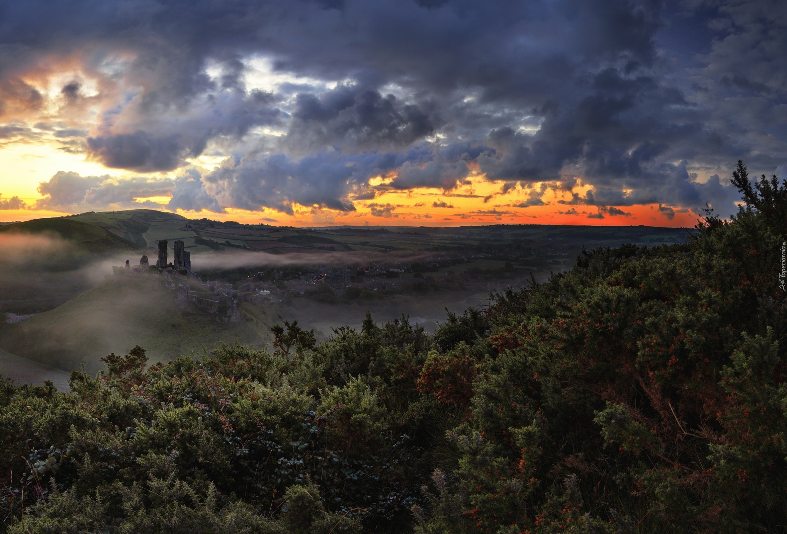 Edytor tapety: Zachód słońca, Chmury, Mgła, Zamek w Corfe Castle, Hrabstwo Dorset, Anglia, Ruiny, Wzgórza