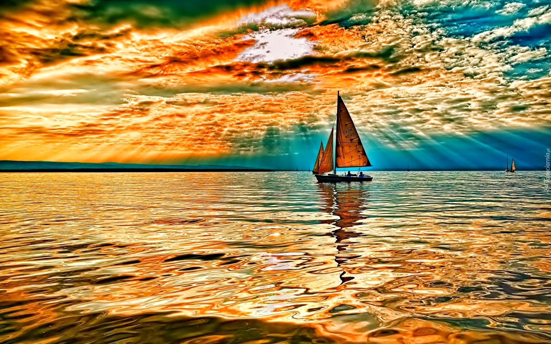 Edytor tapety: Żaglówka, Morze, Promienie, Słońca, Fale