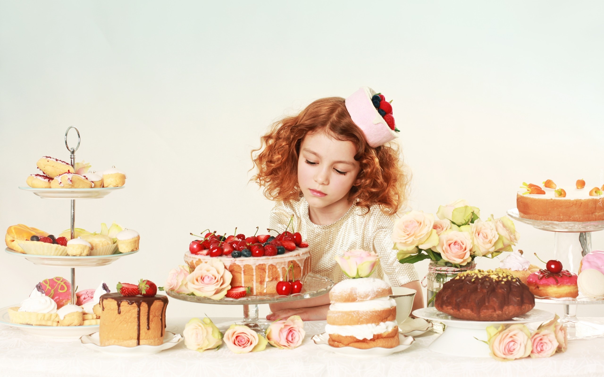 Edytor tapety: Dziecko, Rudowłosa, Dziewczynka, Ciasta, Babeczki, Kwiaty, Róże