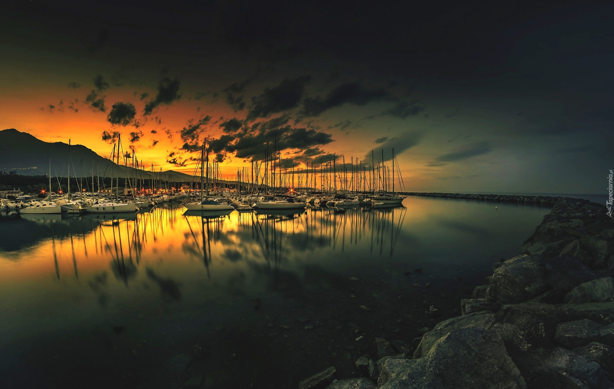 Edytor tapety: Jezioro, Skały, Zachód Słońca, Jachty