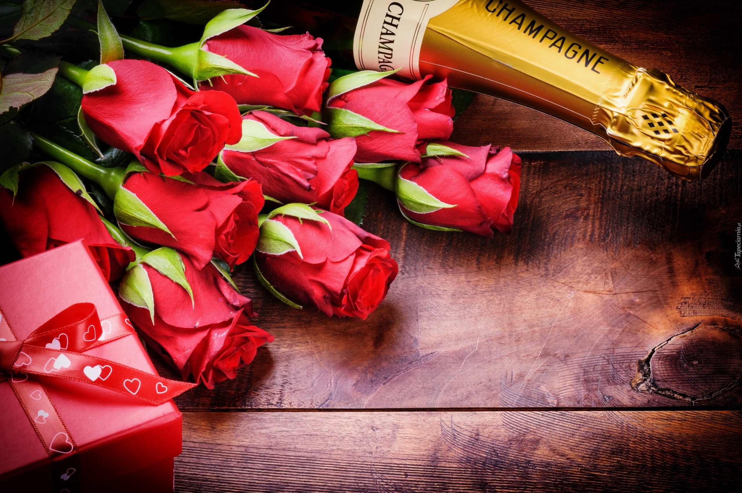 Edytor tapety: Czerwone pudełko, Szampan, Czerwone Róże, Deska