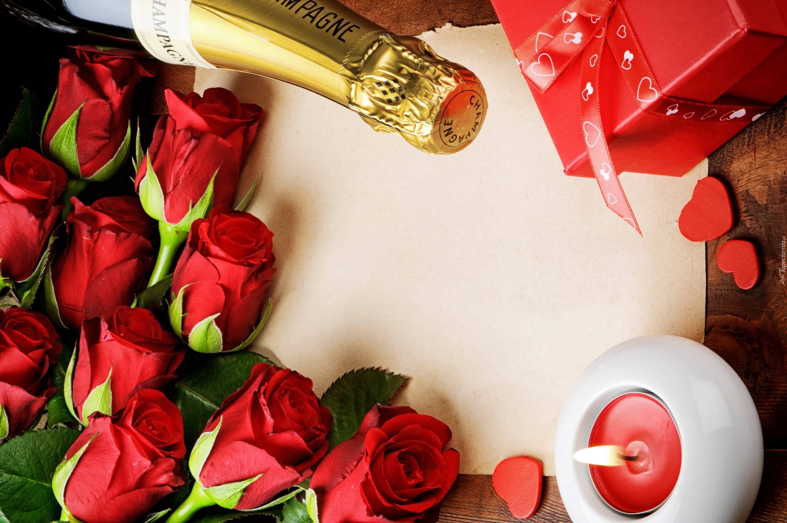 Edytor tapety: Szampan, Róże, Świeca, Kartka, Czerwone pudełko, Deska