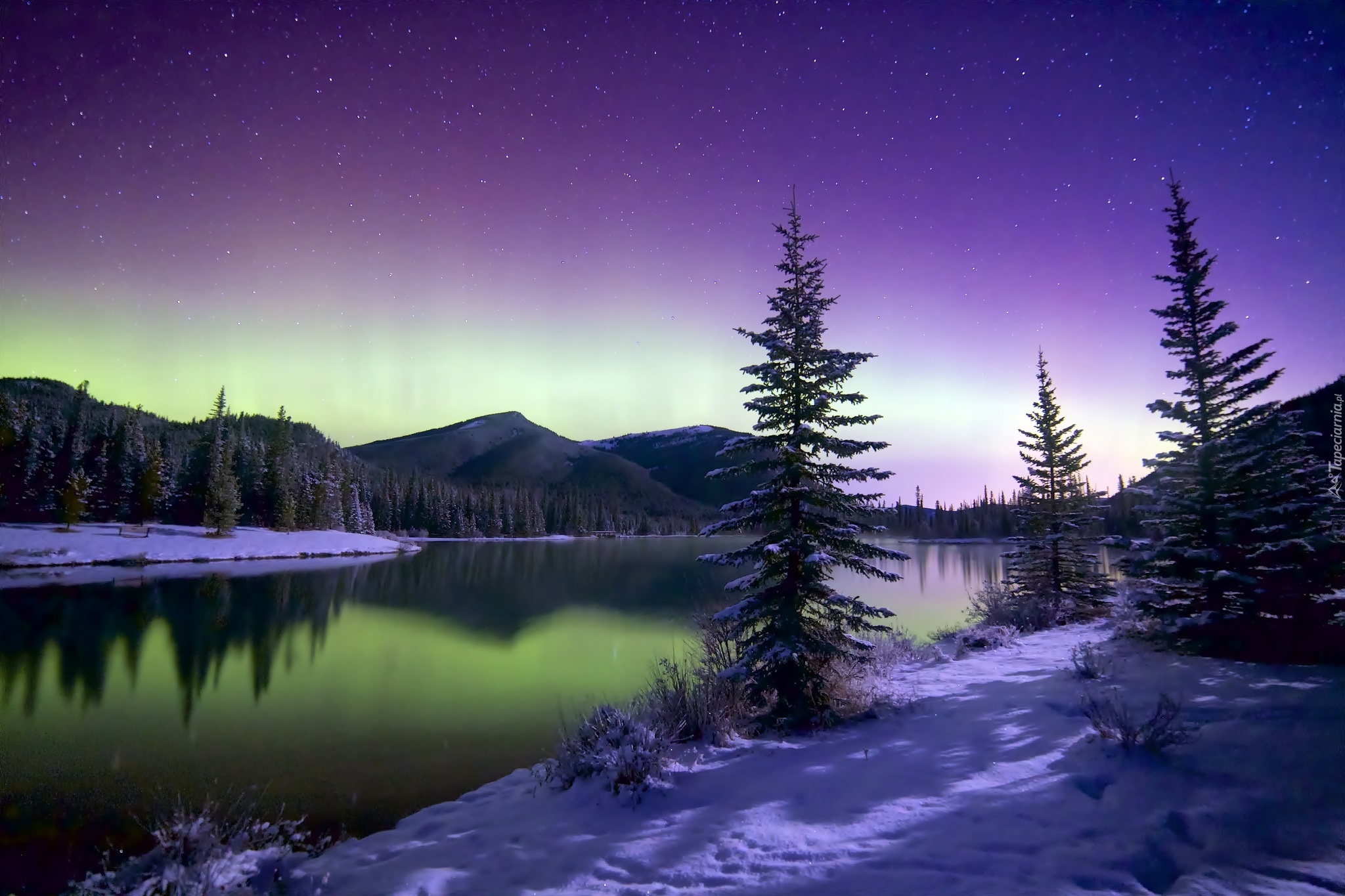 Edytor tapety: Zima, Rzeka, Góry, Las, Zorza Polarna