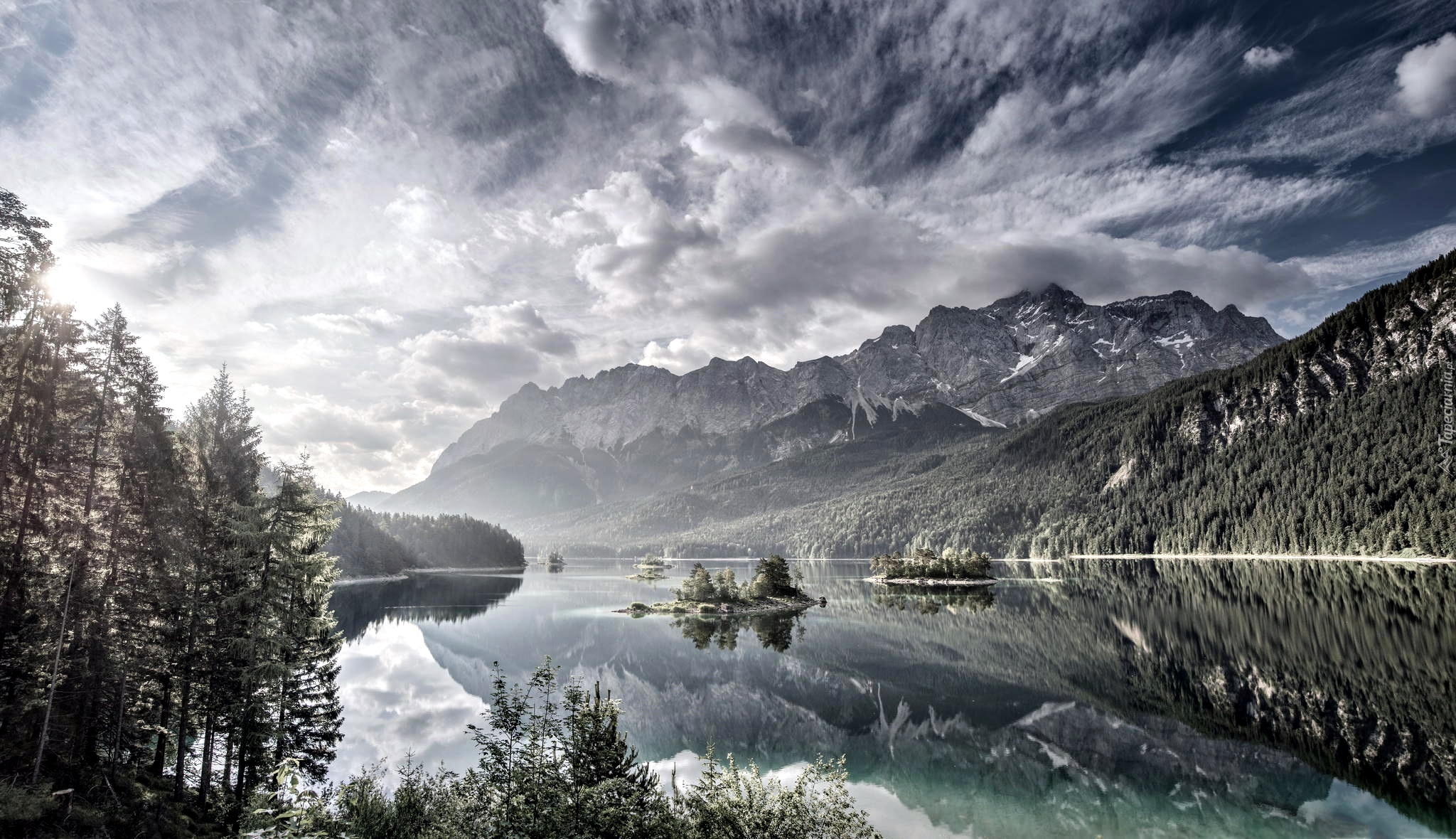 Edytor tapety: Chmury, Góry, Lasy, Jezioro, Wyspy