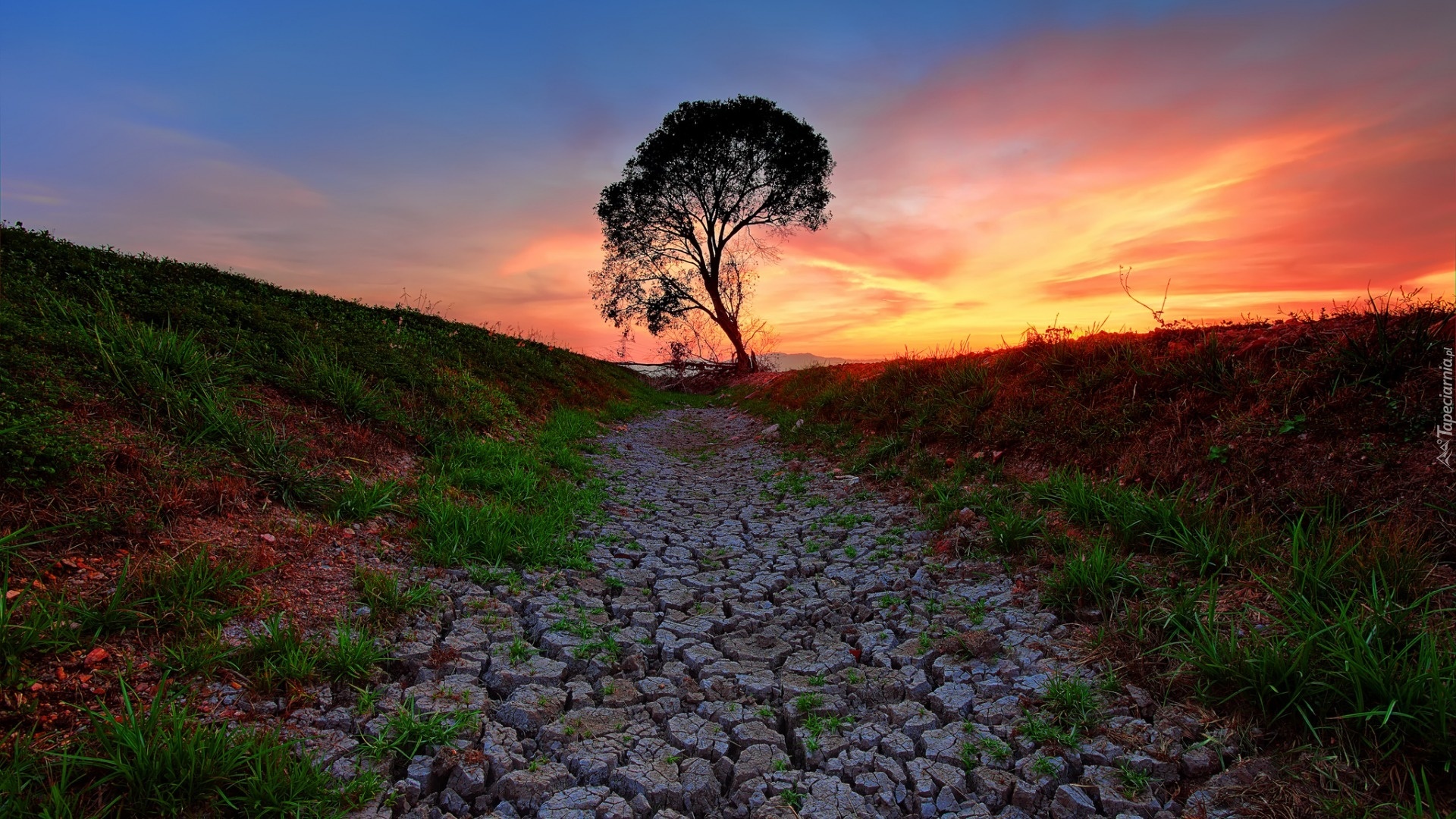 Edytor tapety: Zachód, Słońca, Droga, Spękana, Ziemia, Drzewo