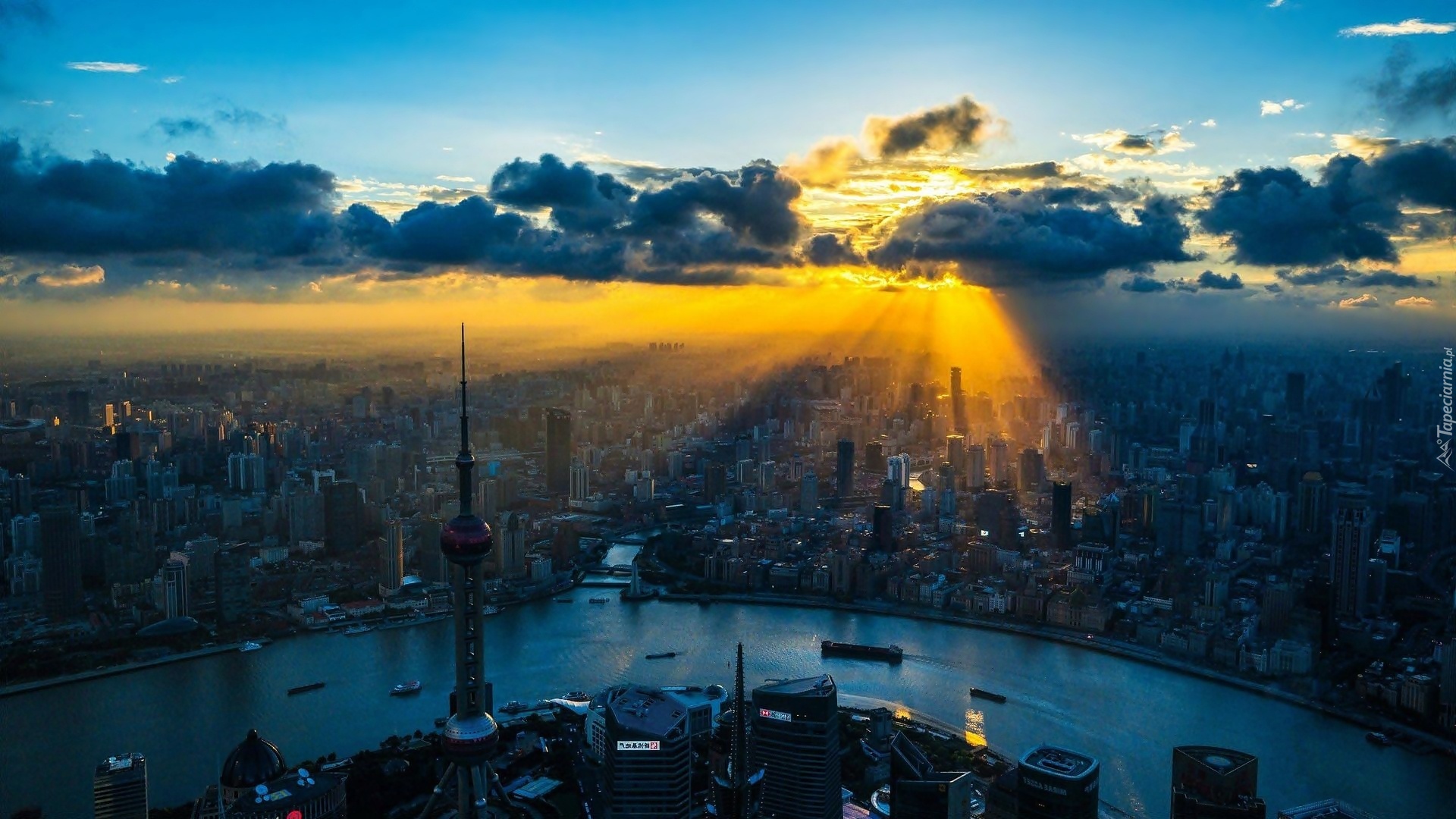 Edytor tapety: Miasto, Szanghaj, Rzeka, Chmury, Z lotu ptaka