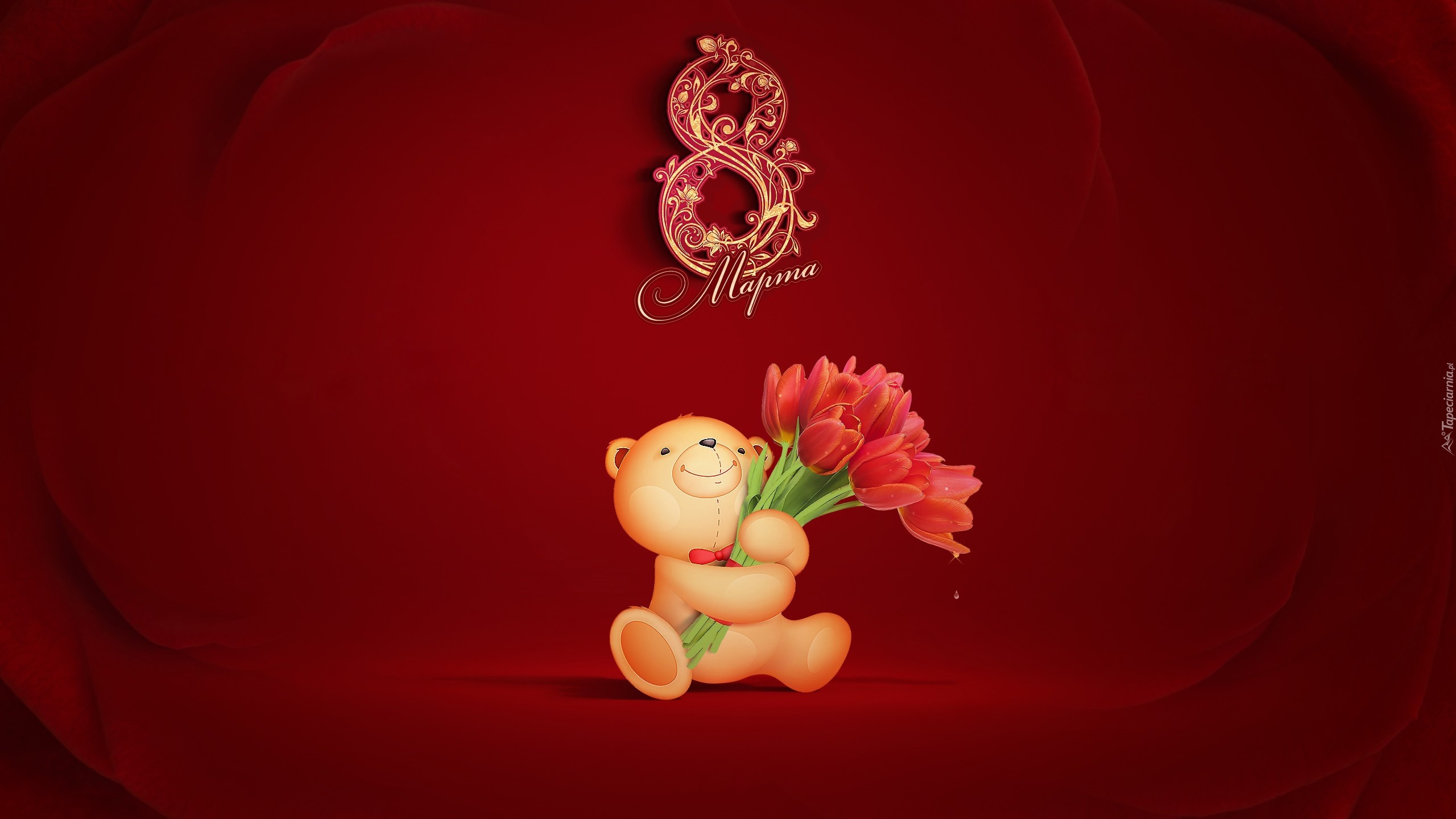 Edytor tapety: Dzień Kobiet, Miś, Bukiet, Tulipanów, Czerwone, Tło