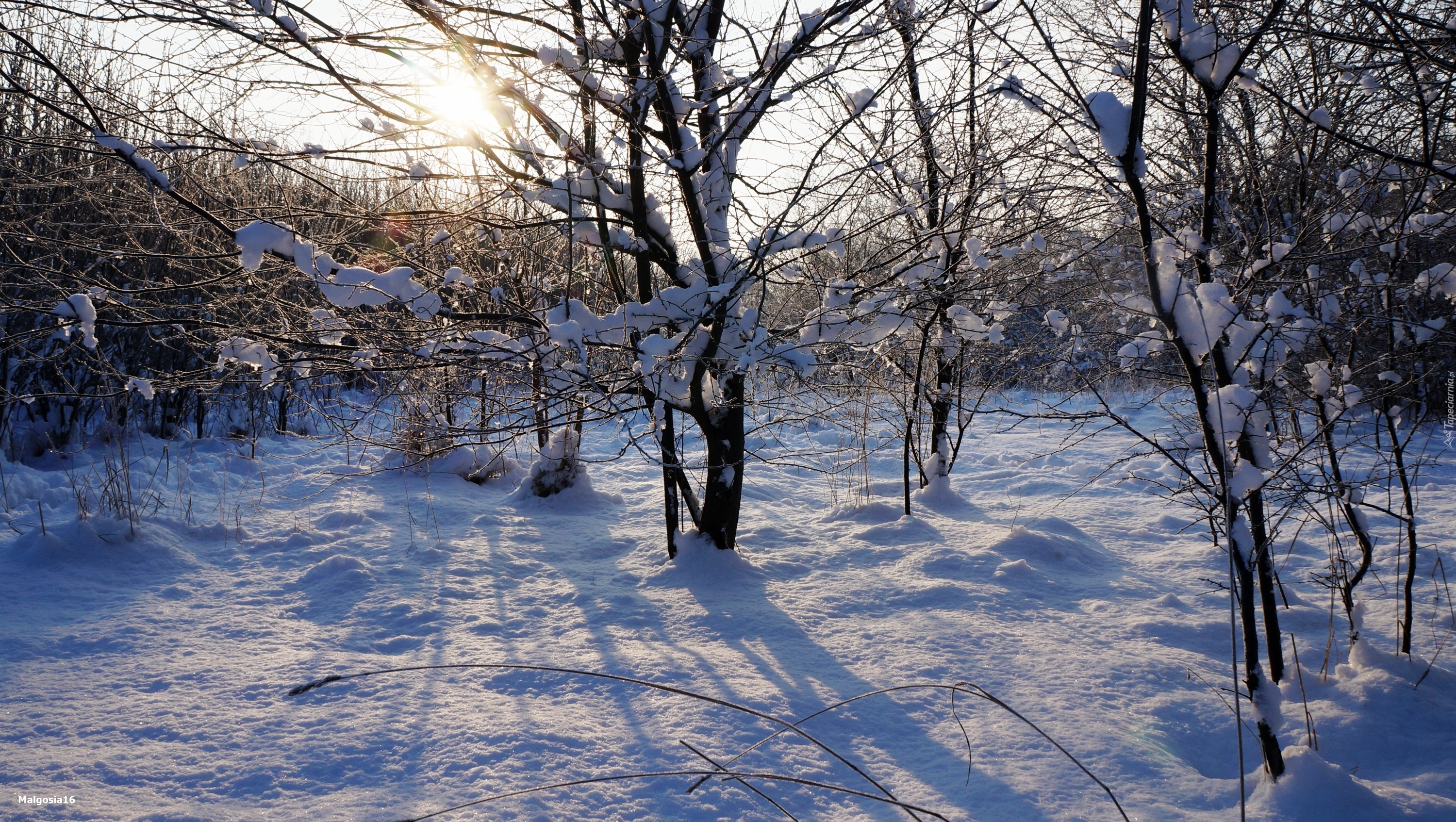 Edytor tapety: Zima, Drzewa, Śnieg, Gałęzie, Przebijające Światło, Słońce