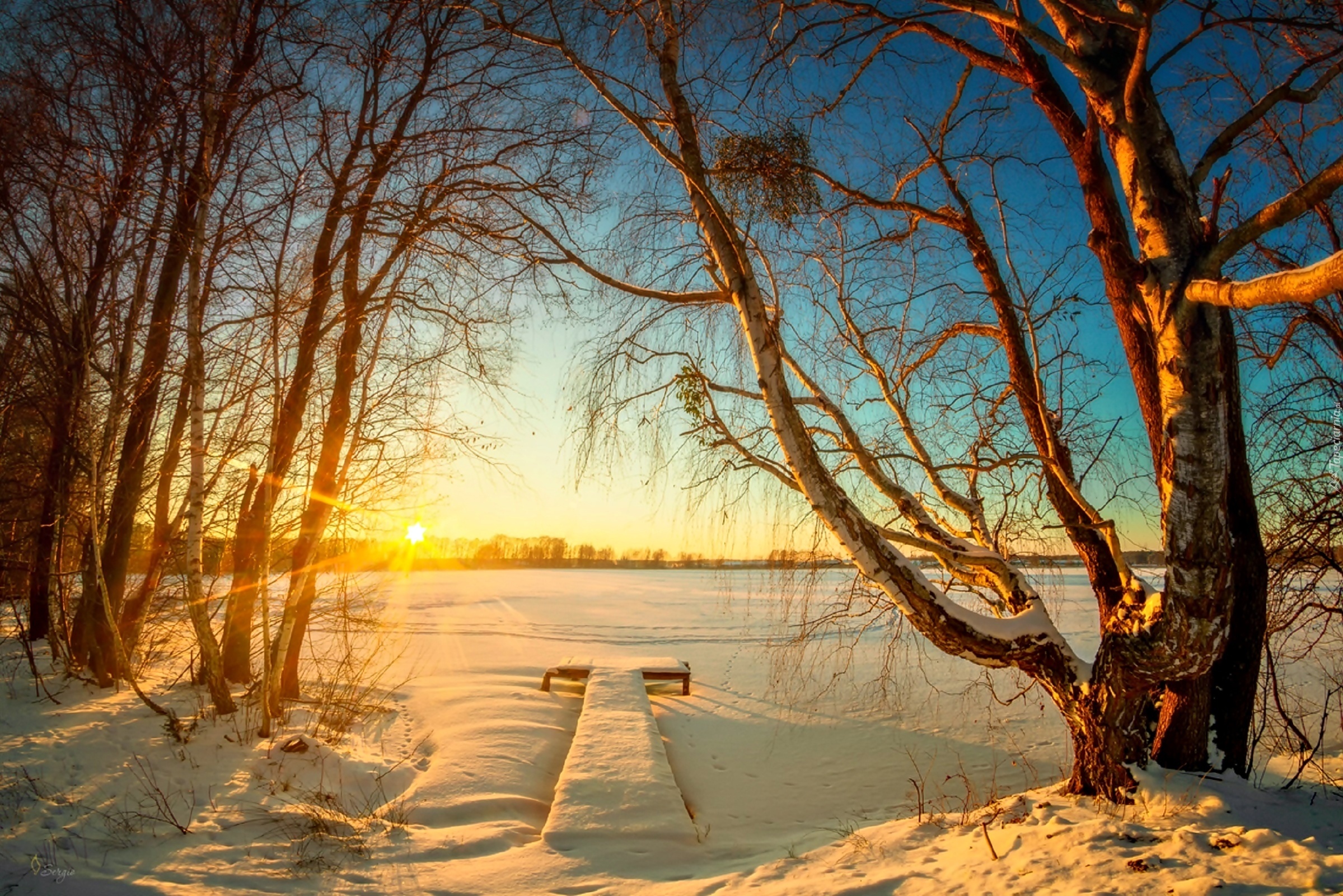 Edytor tapety: Zima, Jezioro, Promienie Słońca, Pomost, Drzewa
