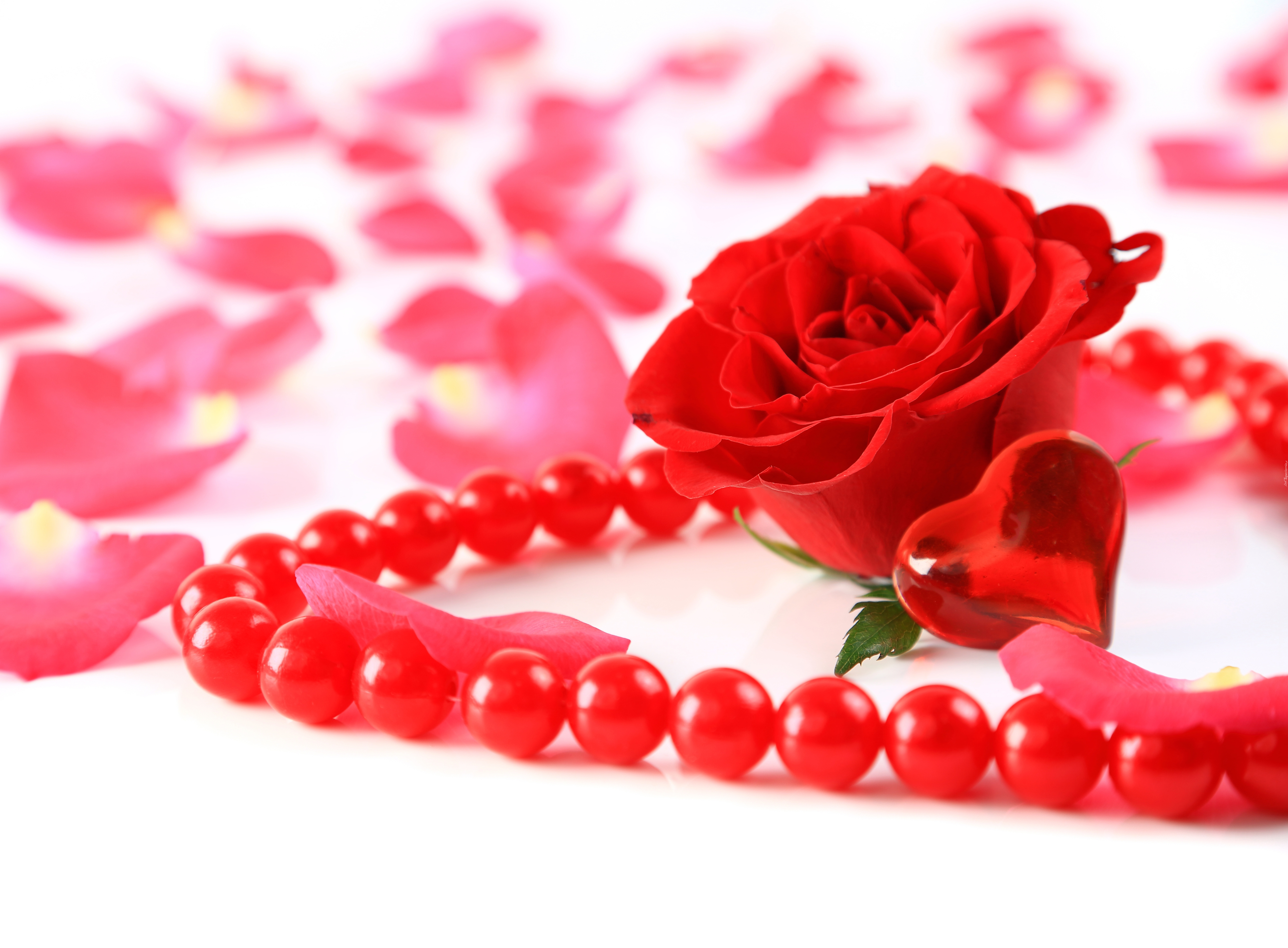 Edytor tapety: Czerwone perły, Serce, Czerwona róża, Płatki rózy