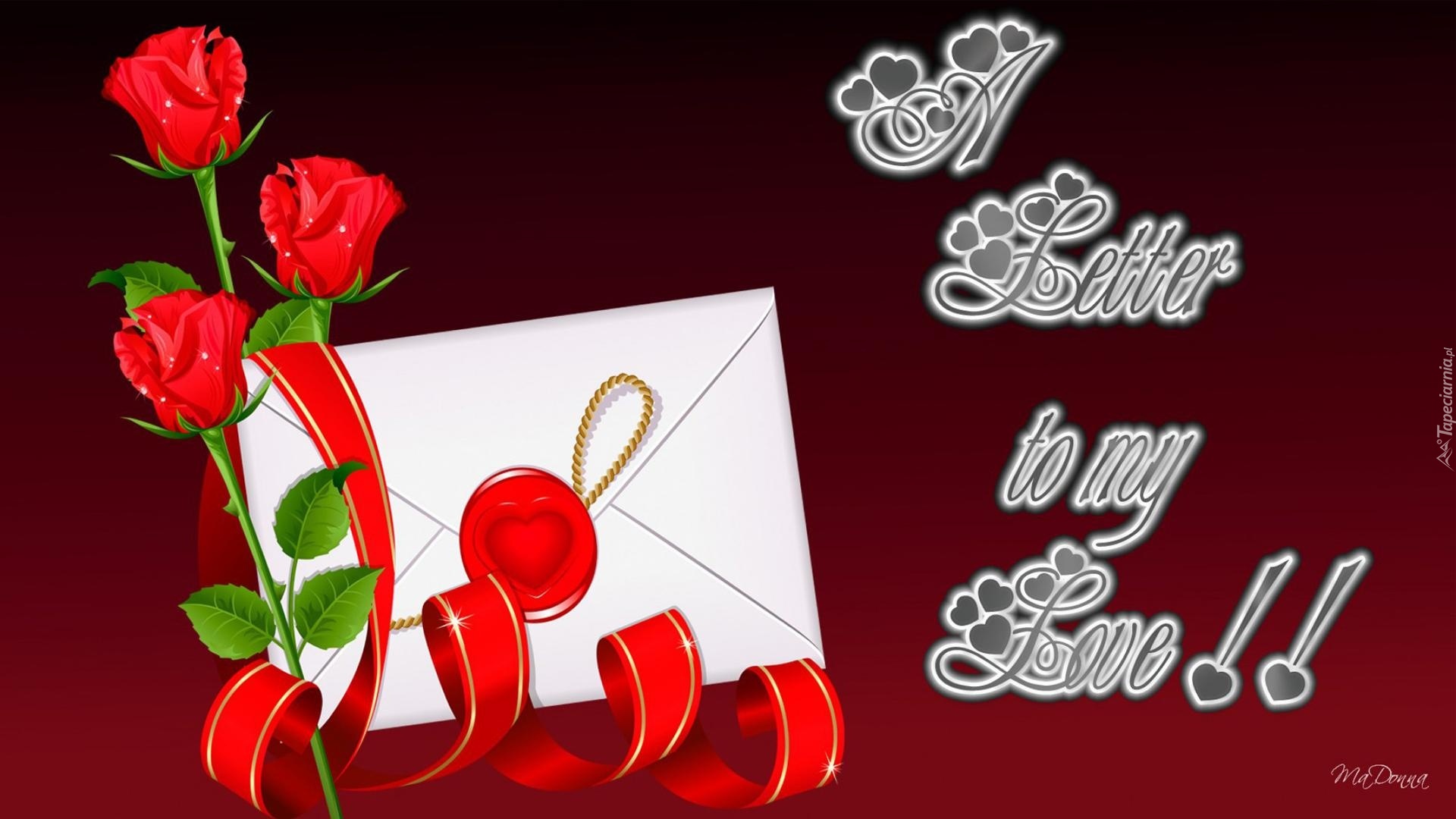 Edytor tapety: Koperta, Pieczęć lakowa, Róże, Wstęga, Napis, Bordowe tło