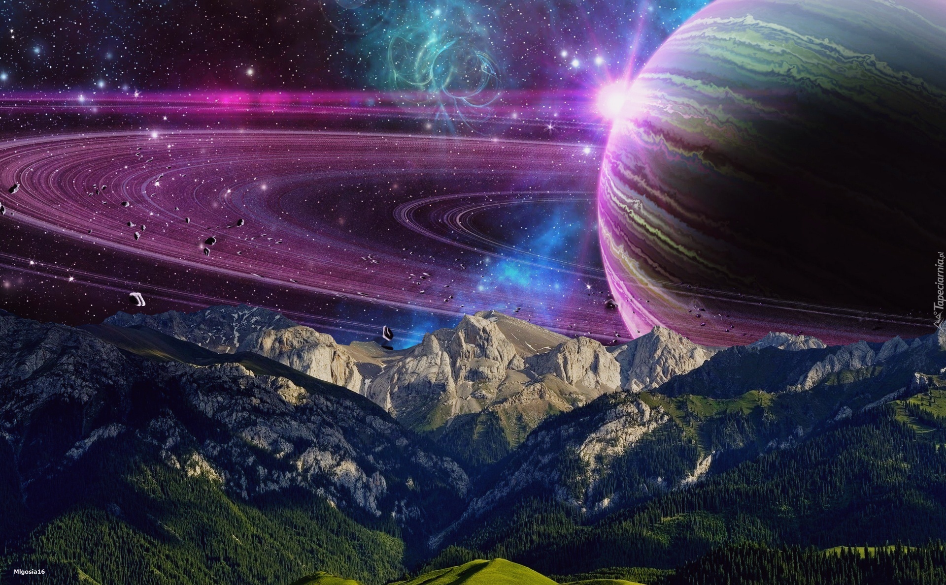 Edytor tapety: Góry, Noc, Planeta, Gwiazdy, Pierścień