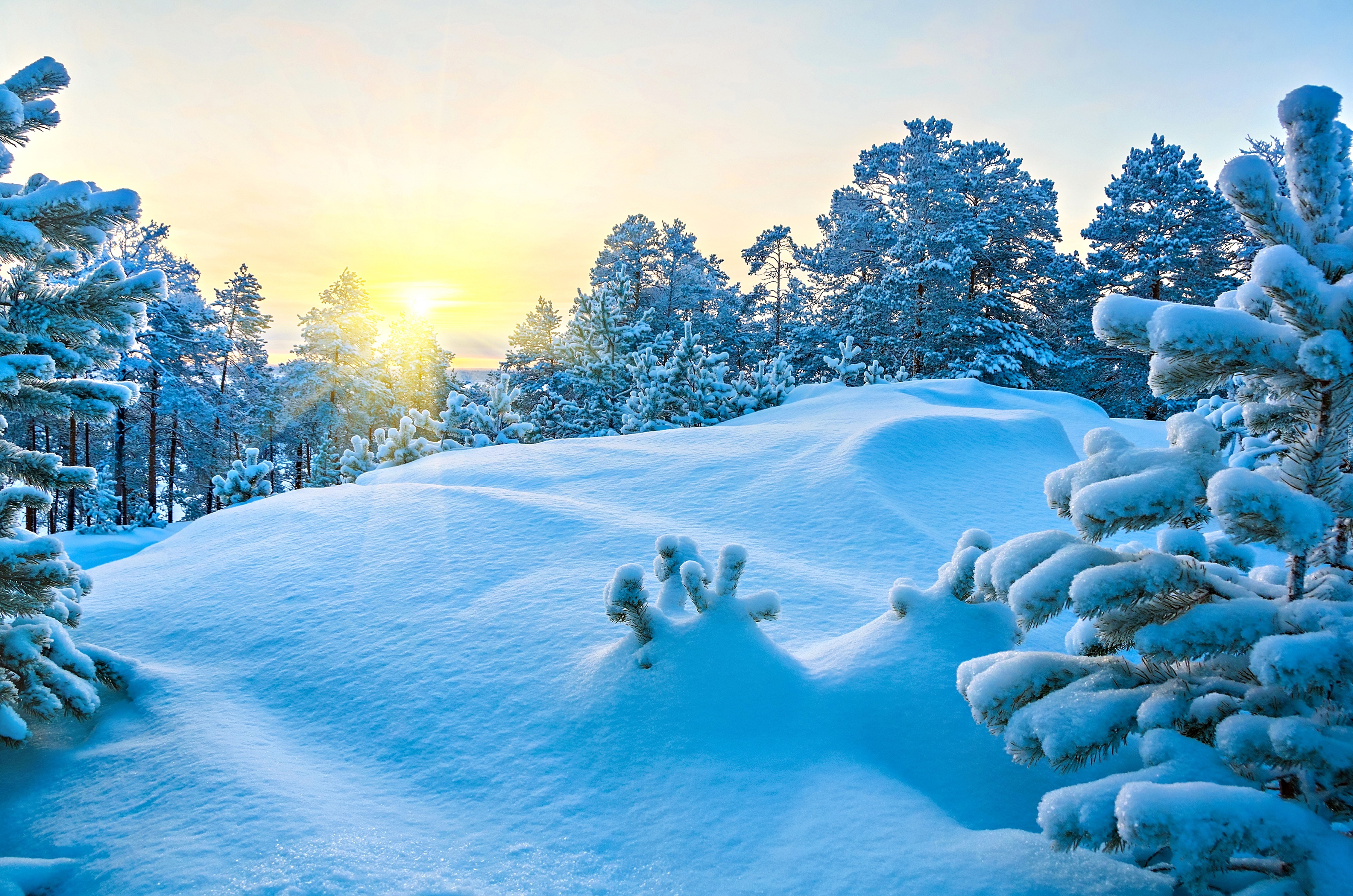 Edytor tapety: Zima, Zaspy, Drzewa, Wschód słońca