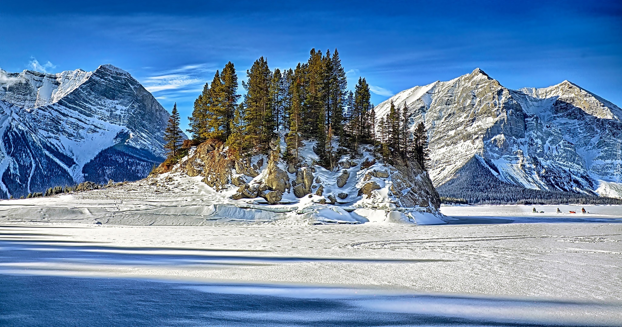 Edytor tapety: Zima, Góry, Zamarznięte, Jezioro, Wyspa, Drzewa