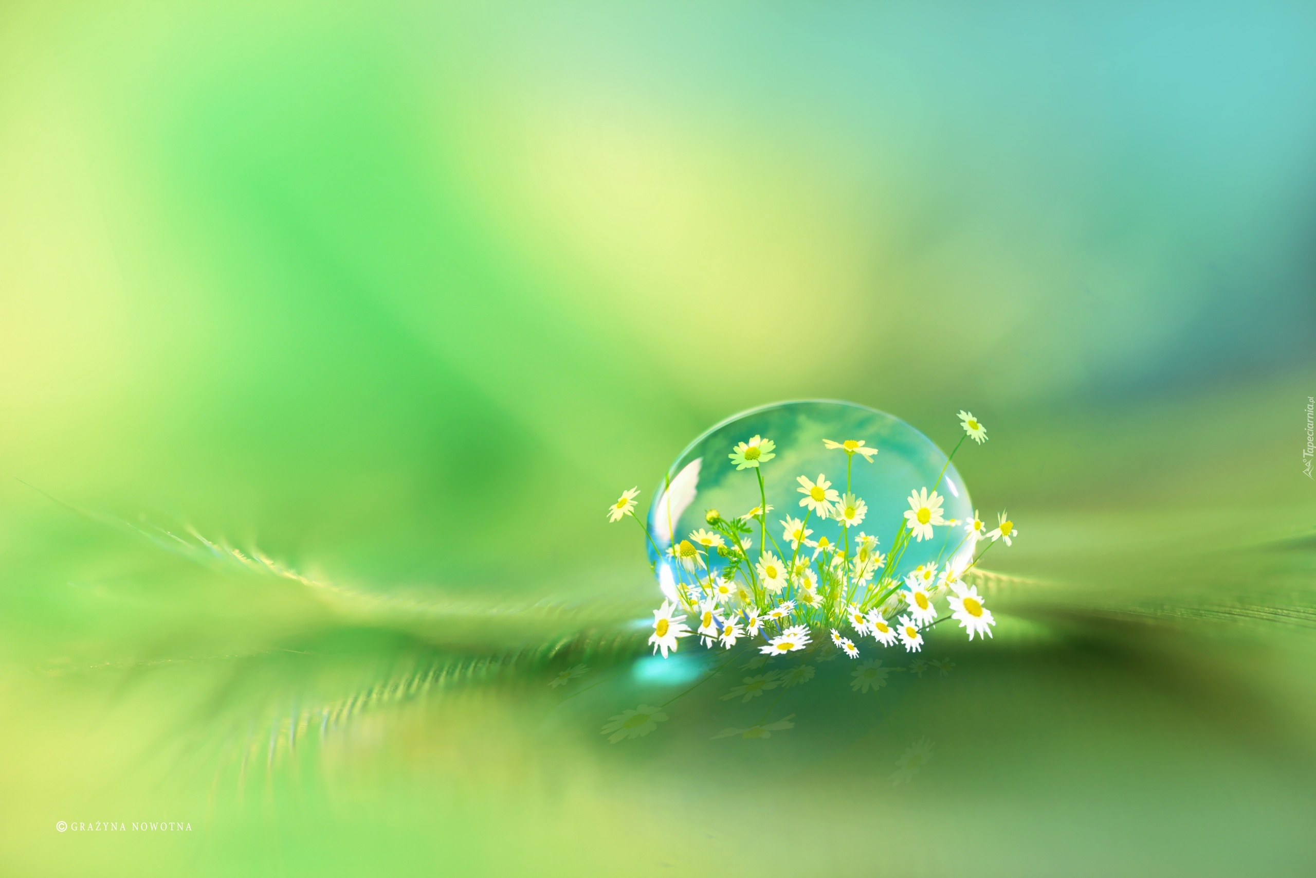 Edytor tapety: Kropla, Makro, Piórko, Margerytki, Kwiaty, Grafika