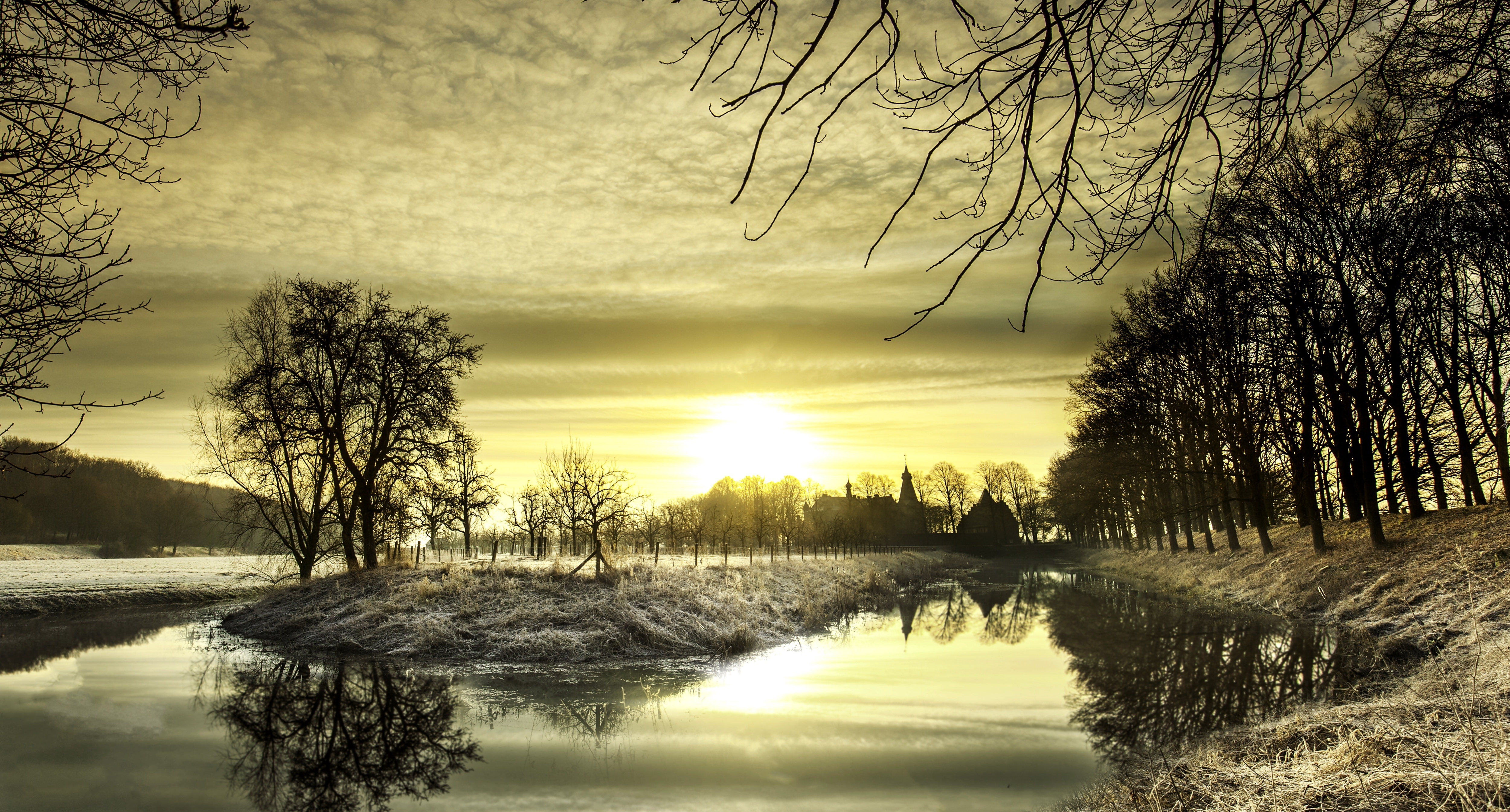 Edytor tapety: Jesień, Rzeka, Drzewa, Zachód, Słońca