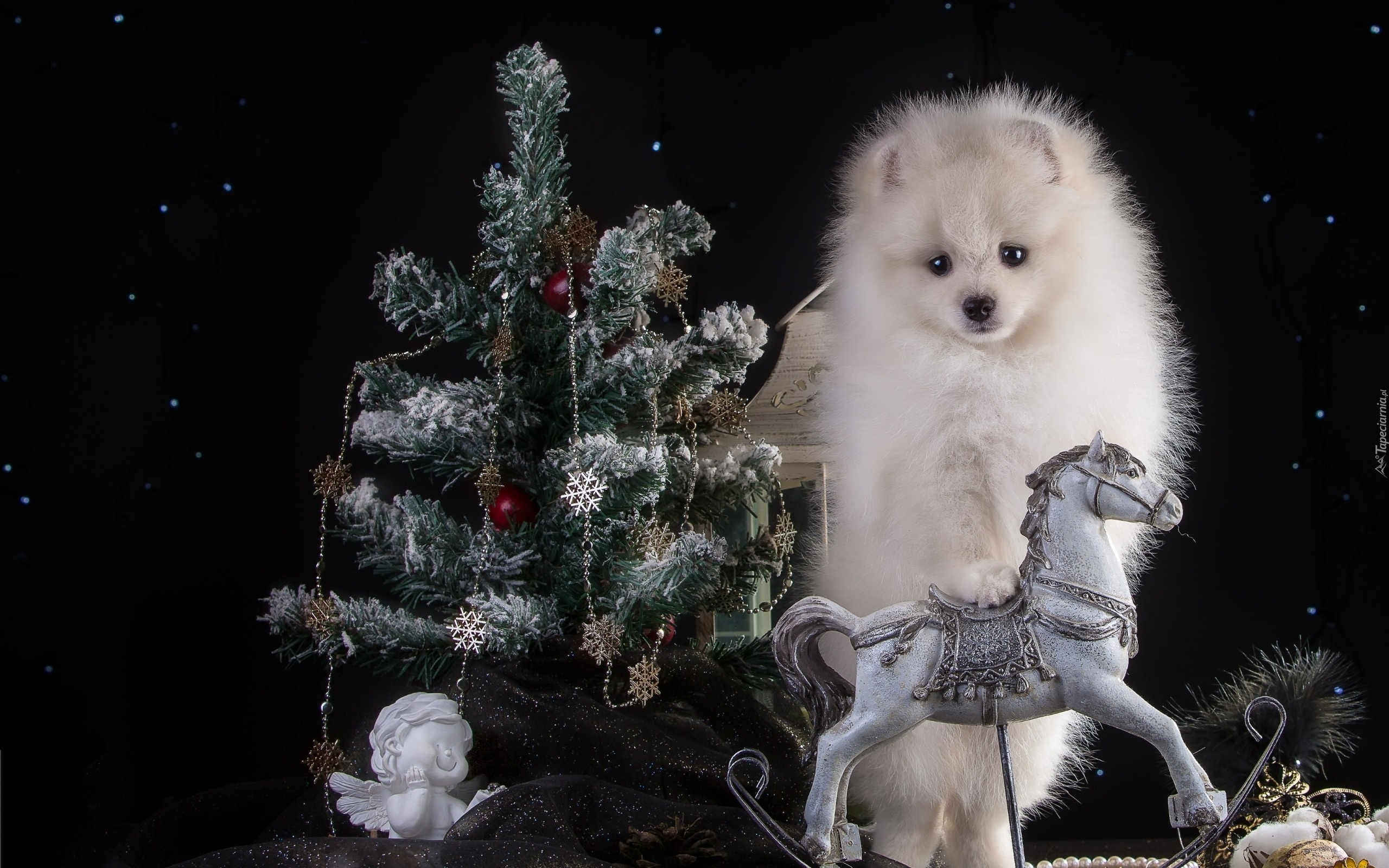 Edytor tapety: Pies, Szpic, Dekoracje, Boże, Narodzenie, Choinka, Konik