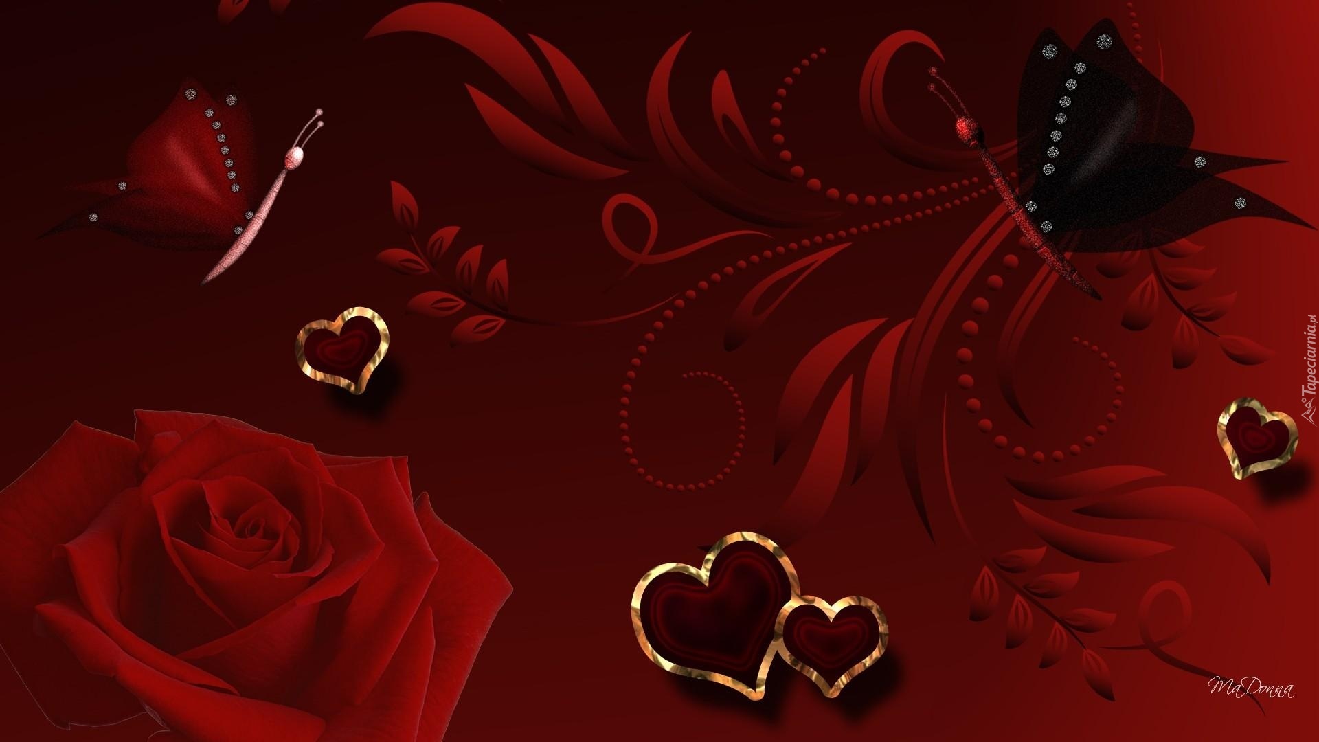 Edytor tapety: Serca w złotej obwolucie, Motyle, Róża, Czerwone tło