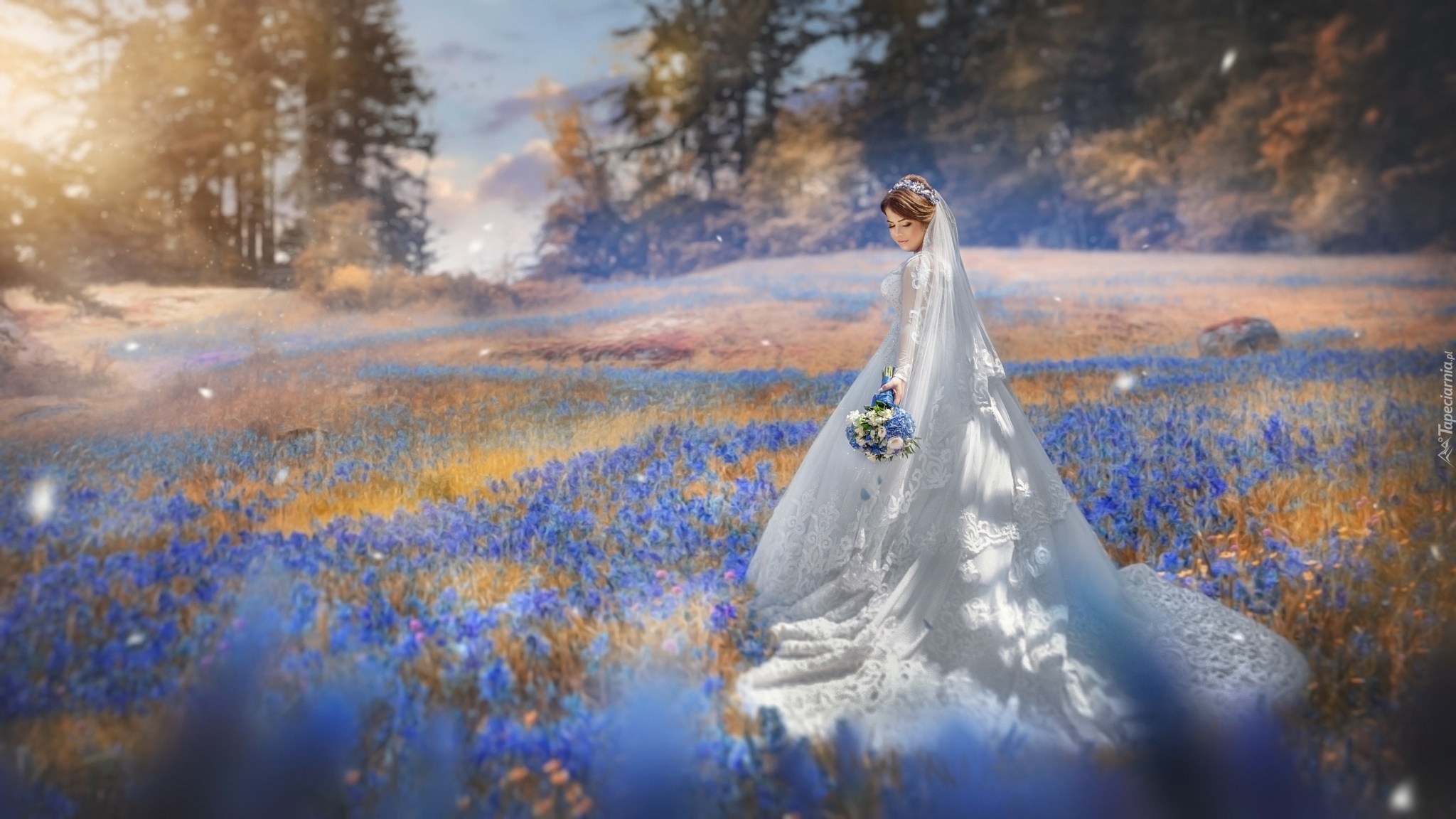Edytor tapety: Kobieta W Białej Sukni, Łąka, Kwiaty, Drzewa