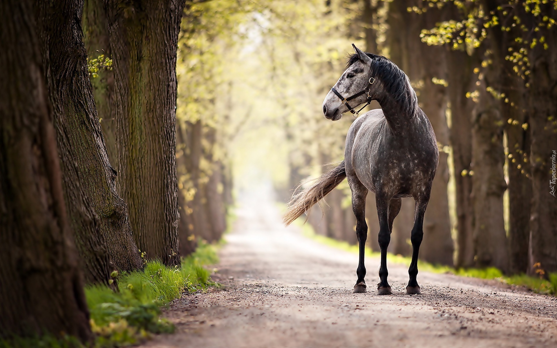 Edytor tapety: Koń, Droga, Drzewa, Poranek