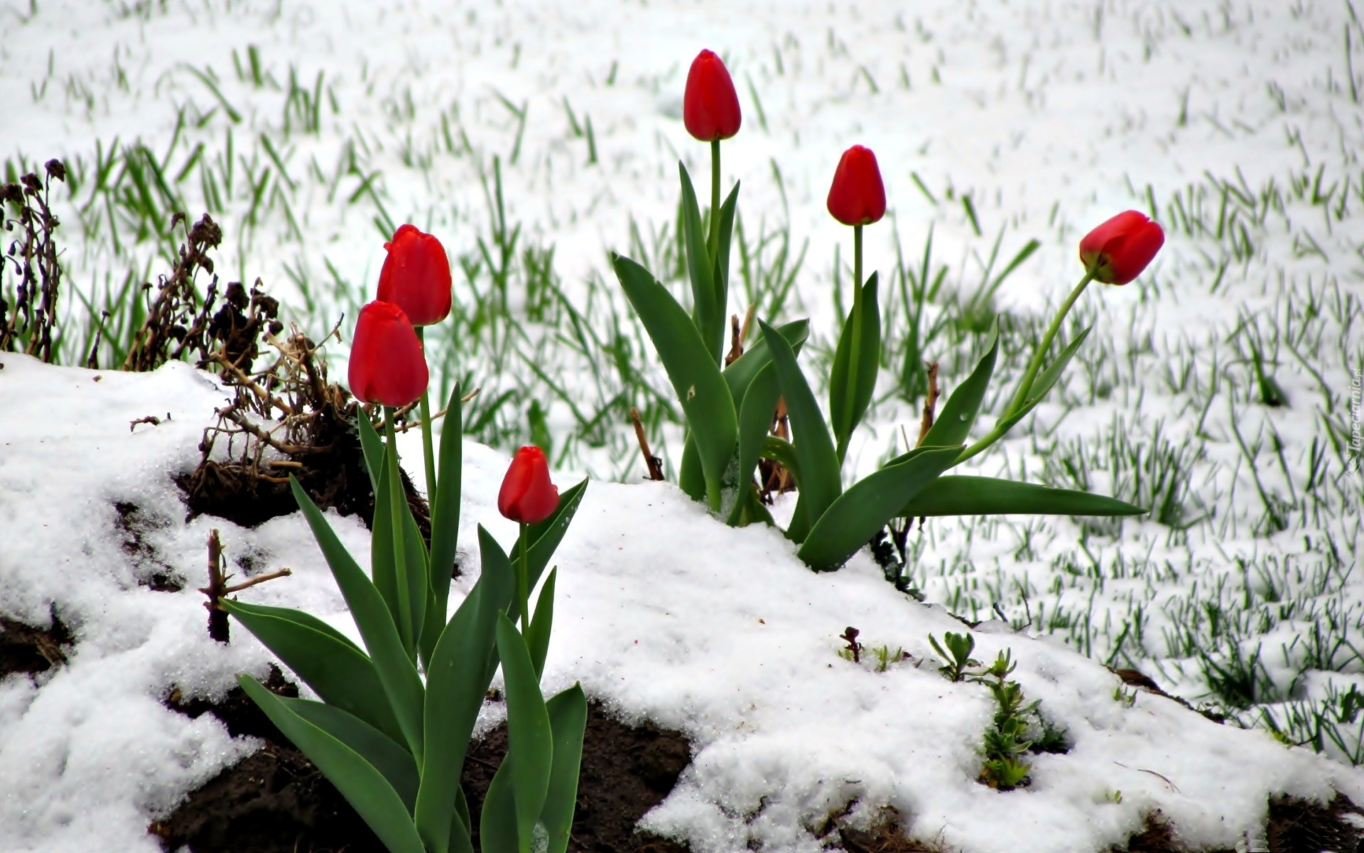 Edytor tapety: Czerwone, Tulipany, Śnieg