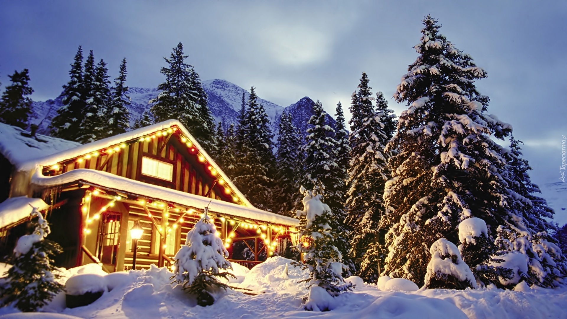 Edytor tapety: Oświetlony, Dom, Drzewa, Lasy, Góry, Zima
