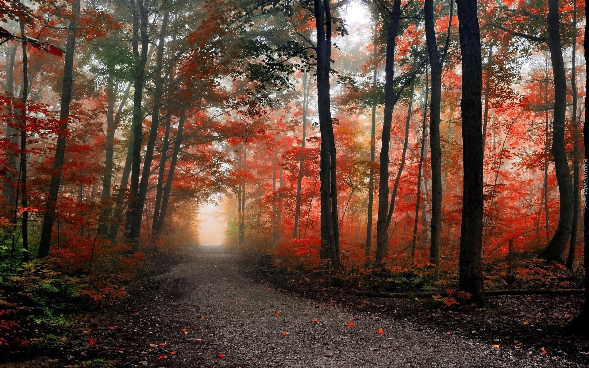 Edytor tapety: Jesień, Las, Droga, Mgła, Drzewa