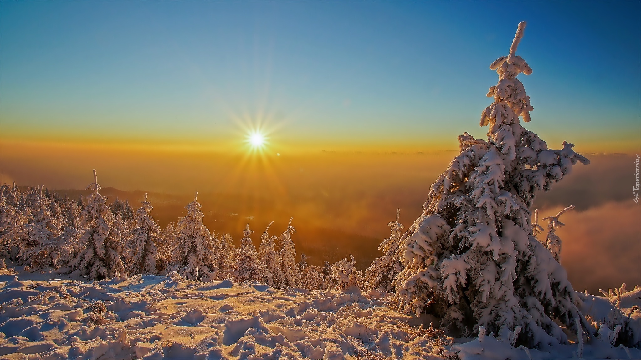 Edytor tapety: Zima, Wzgórza, Ośnieżone, Drzewa, Śnieg, Wschód słońca