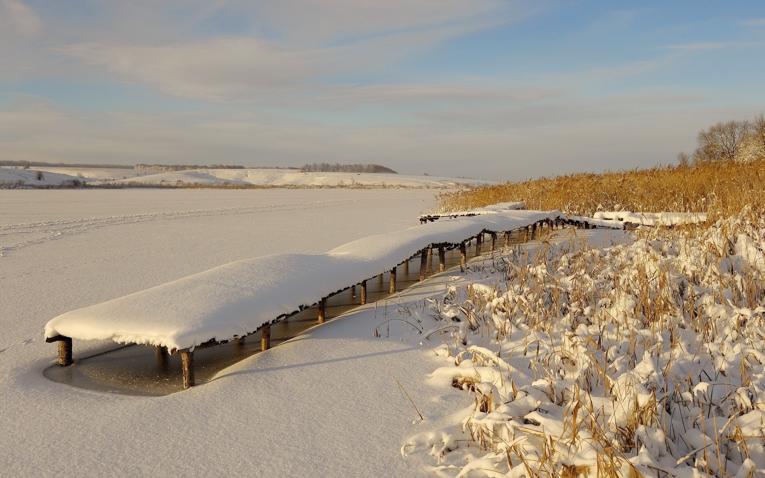 Edytor tapety: Zima, Zamarznięta, Rzeka, Molo, Tatarak