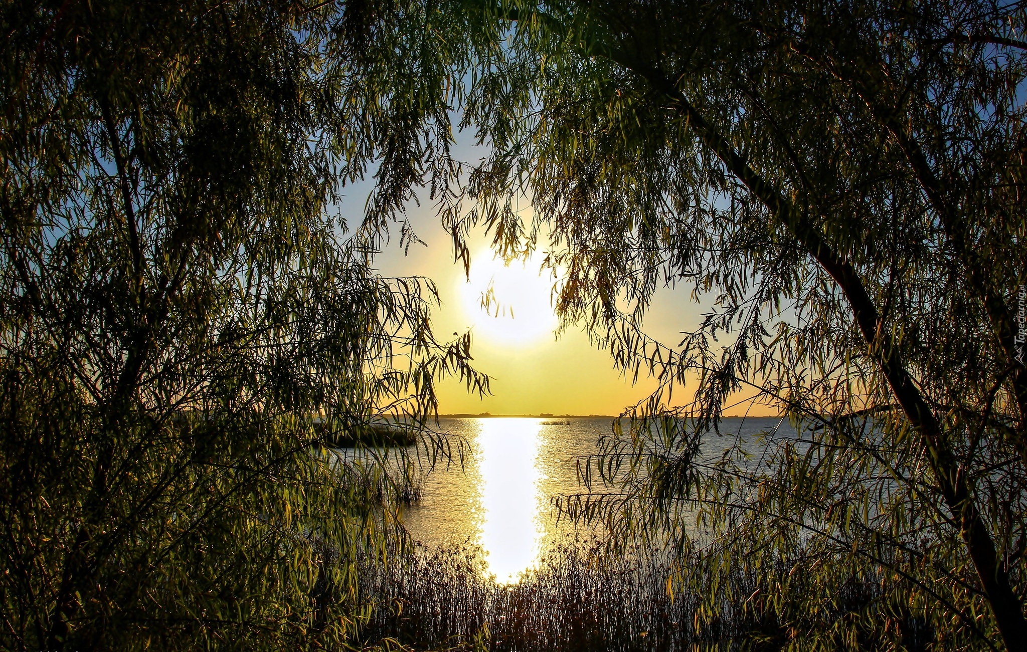 Edytor tapety: Jezioro, Zachód Słońca, Drzewa
