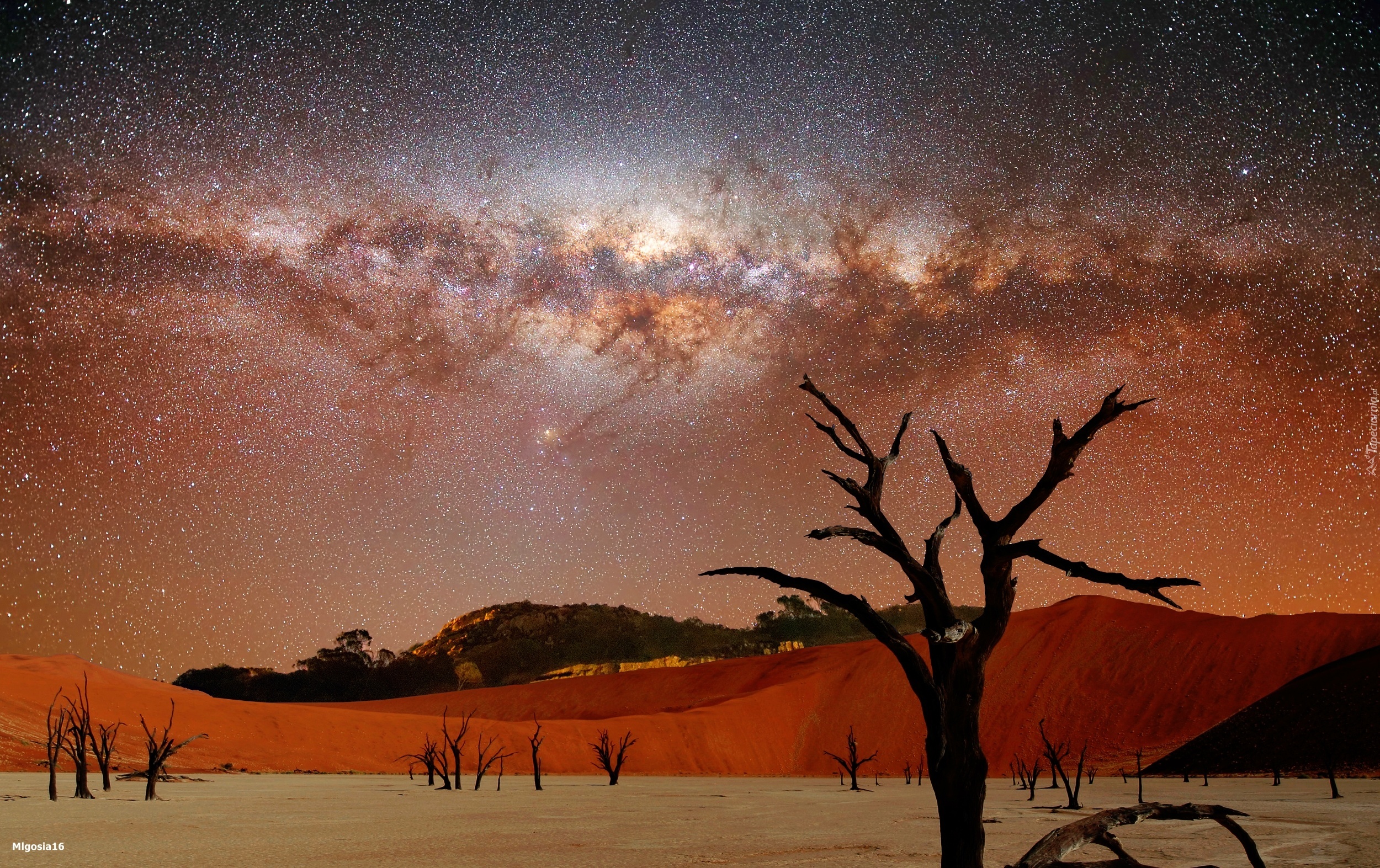 Edytor tapety: Pustynia, Drzewo, Galaktyka, Gwiazdy, Noc