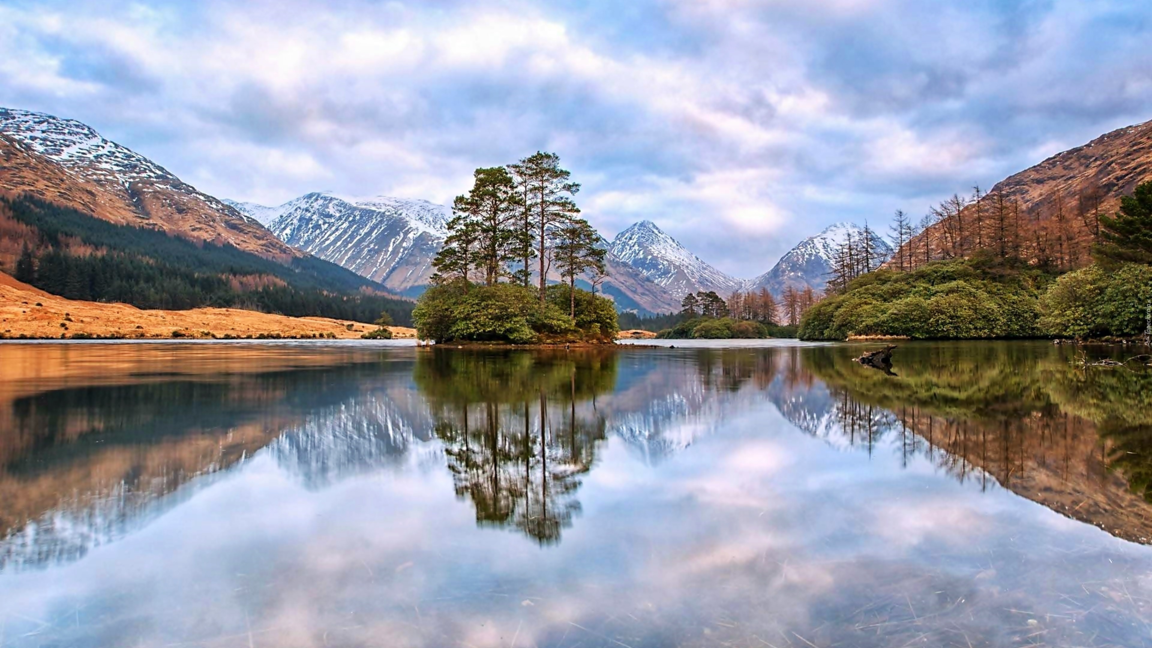 Edytor tapety: Góry, Jezioro, Wyspa, Drzewa