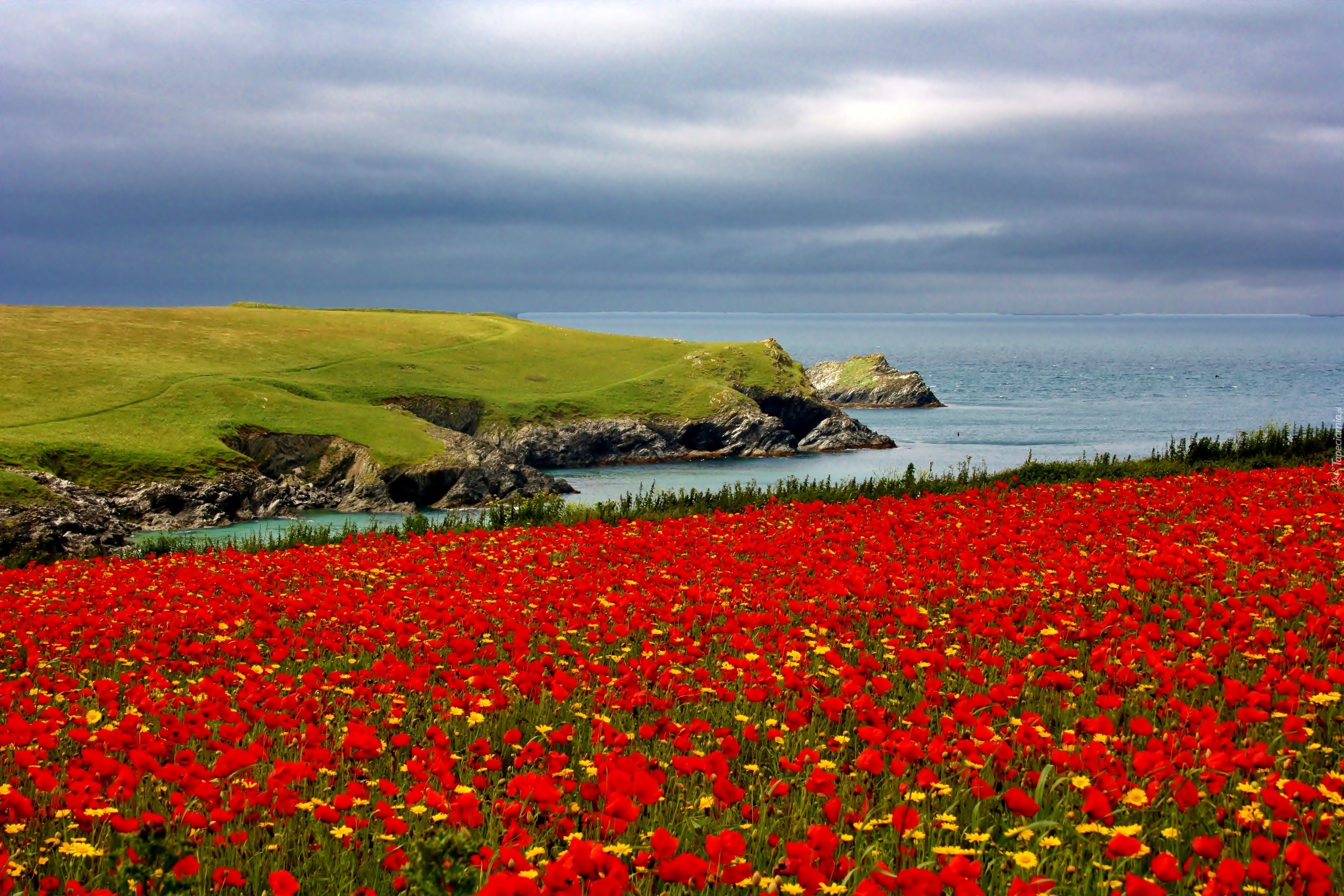 Edytor tapety: Wybrzeże, Klify, Skały, Łąka, Maki, Morze
