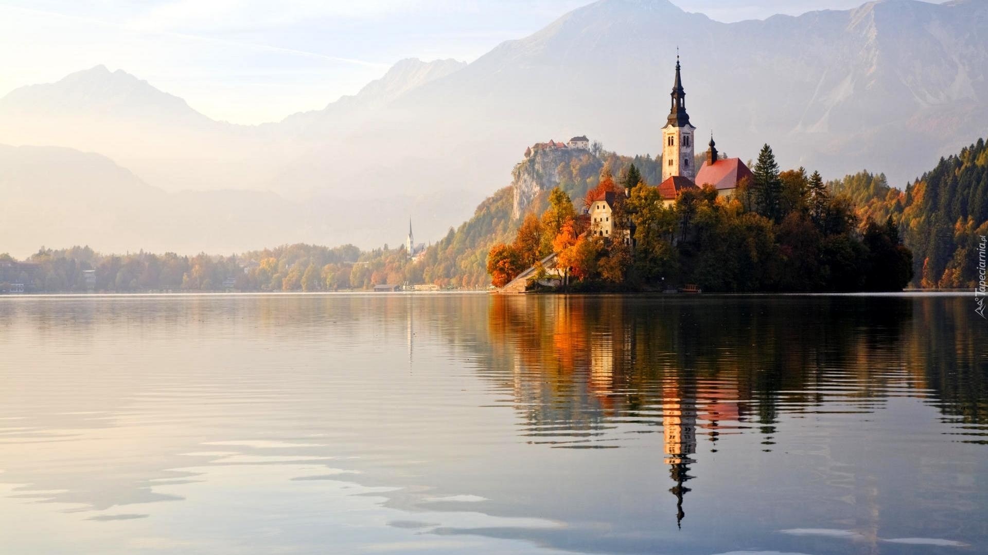 Edytor tapety: Kościół, Wyspa, Góry, Jesień, Jezioro