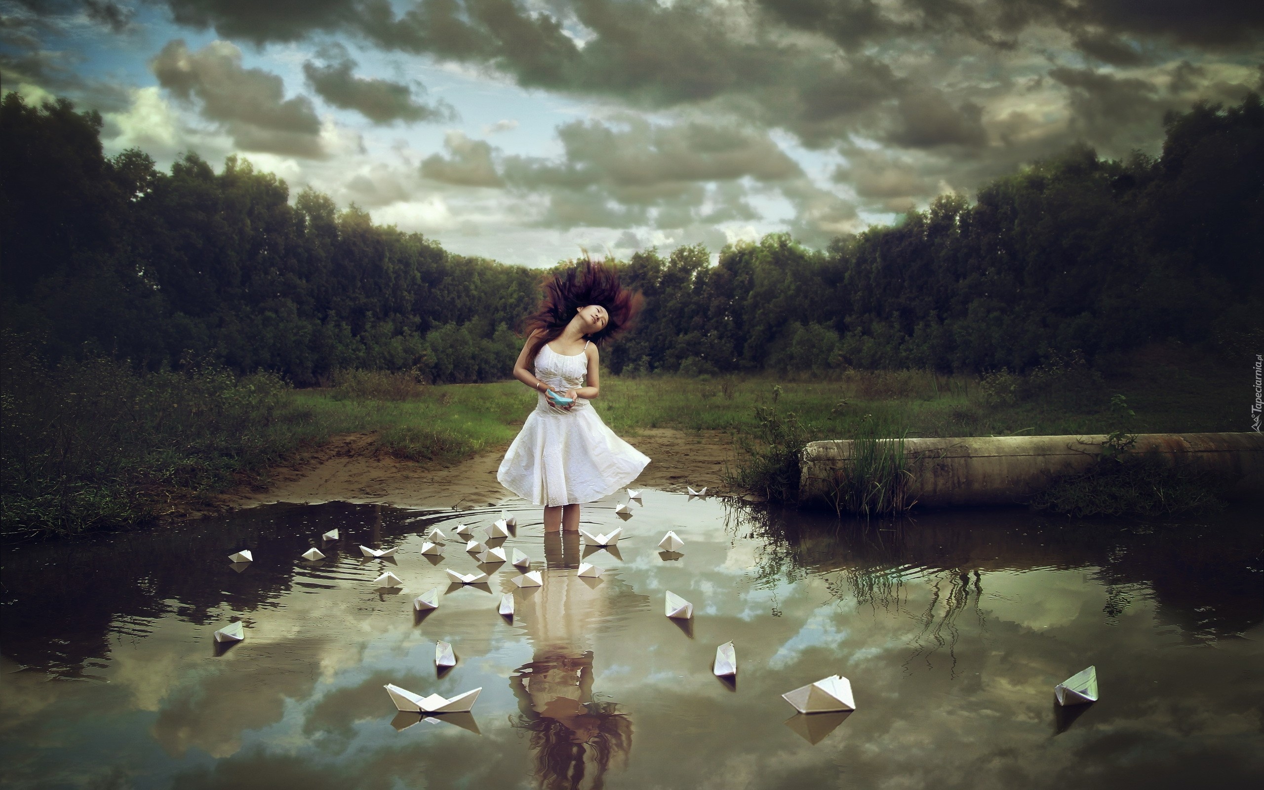 Edytor tapety: Kobieta, Las, Jezioro, Papierowe, Łódki