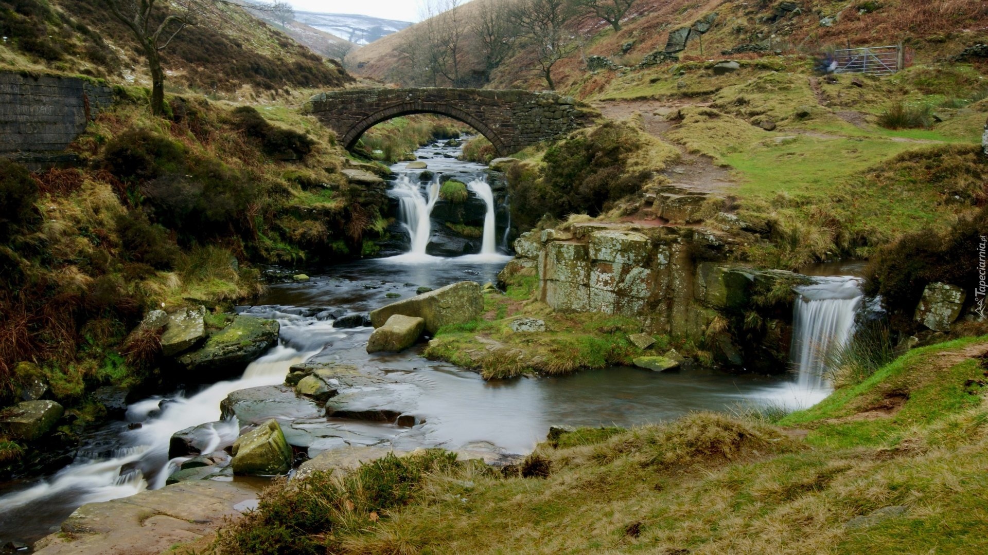 Edytor tapety: Rzeczka, Pomost, Polana, Wodospad