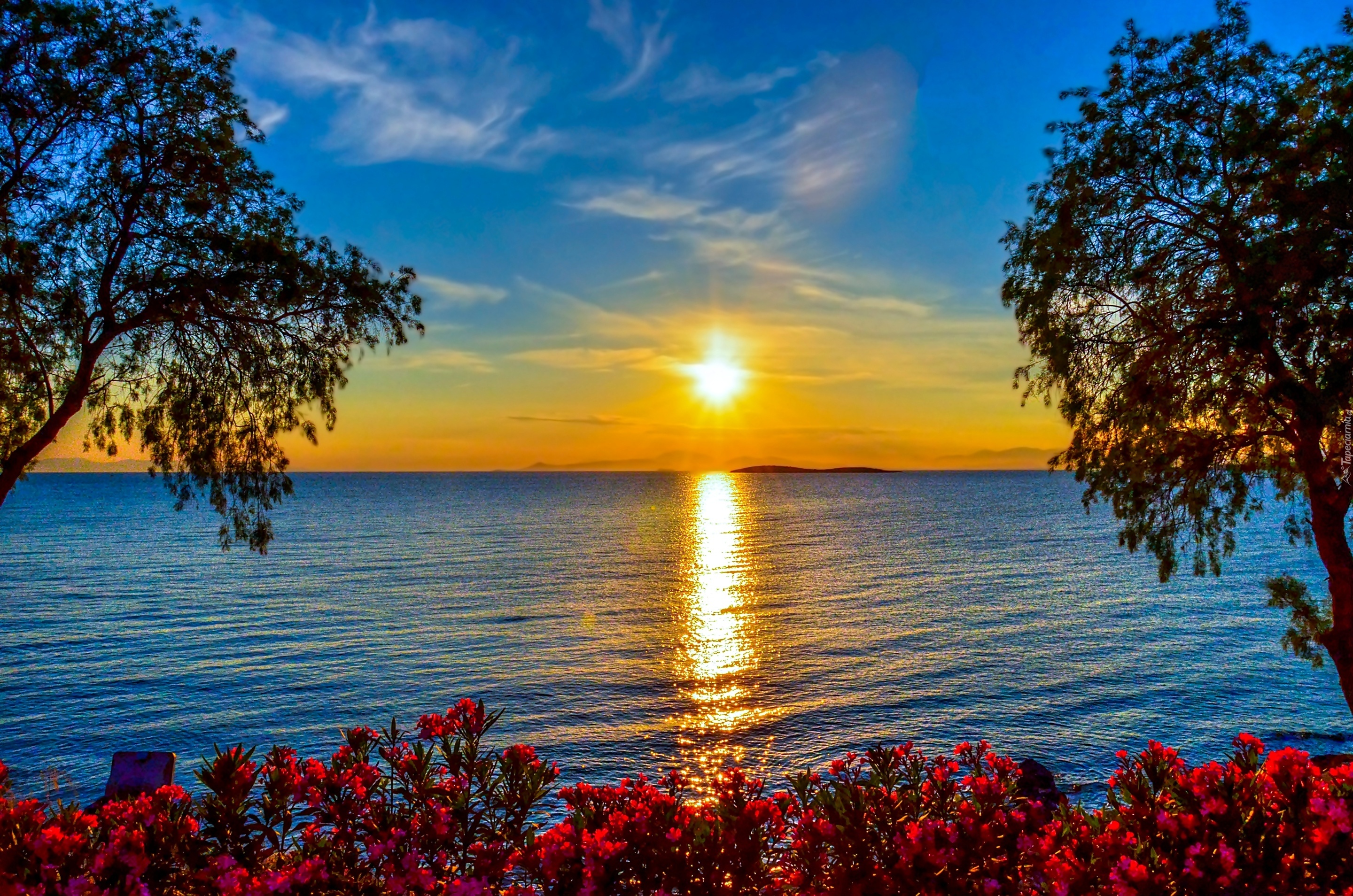 Edytor tapety: Morze, Zachód Słońca, Krzewy, Gałęzie