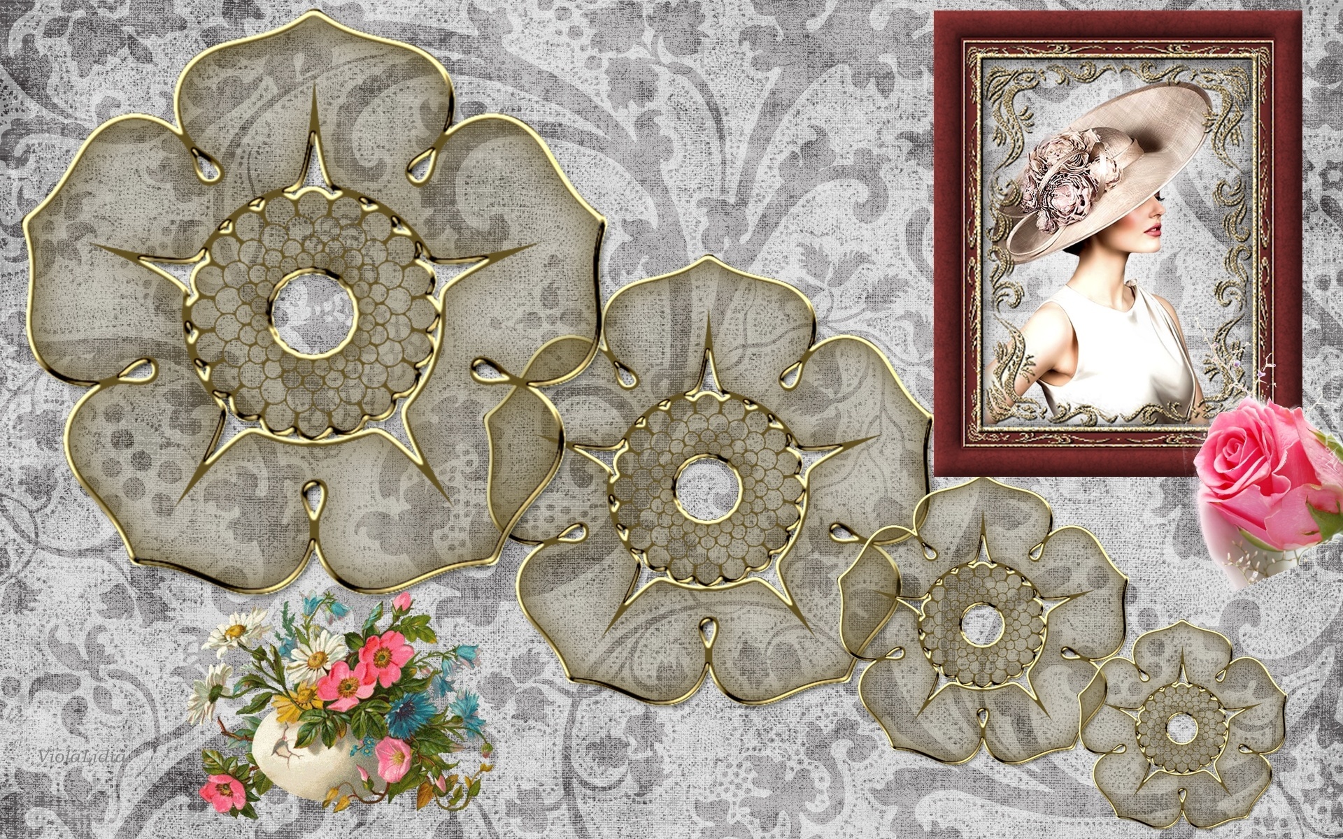 Edytor tapety: Portret, Kobieta, Kapelusz, Bukiet, Kwiaty