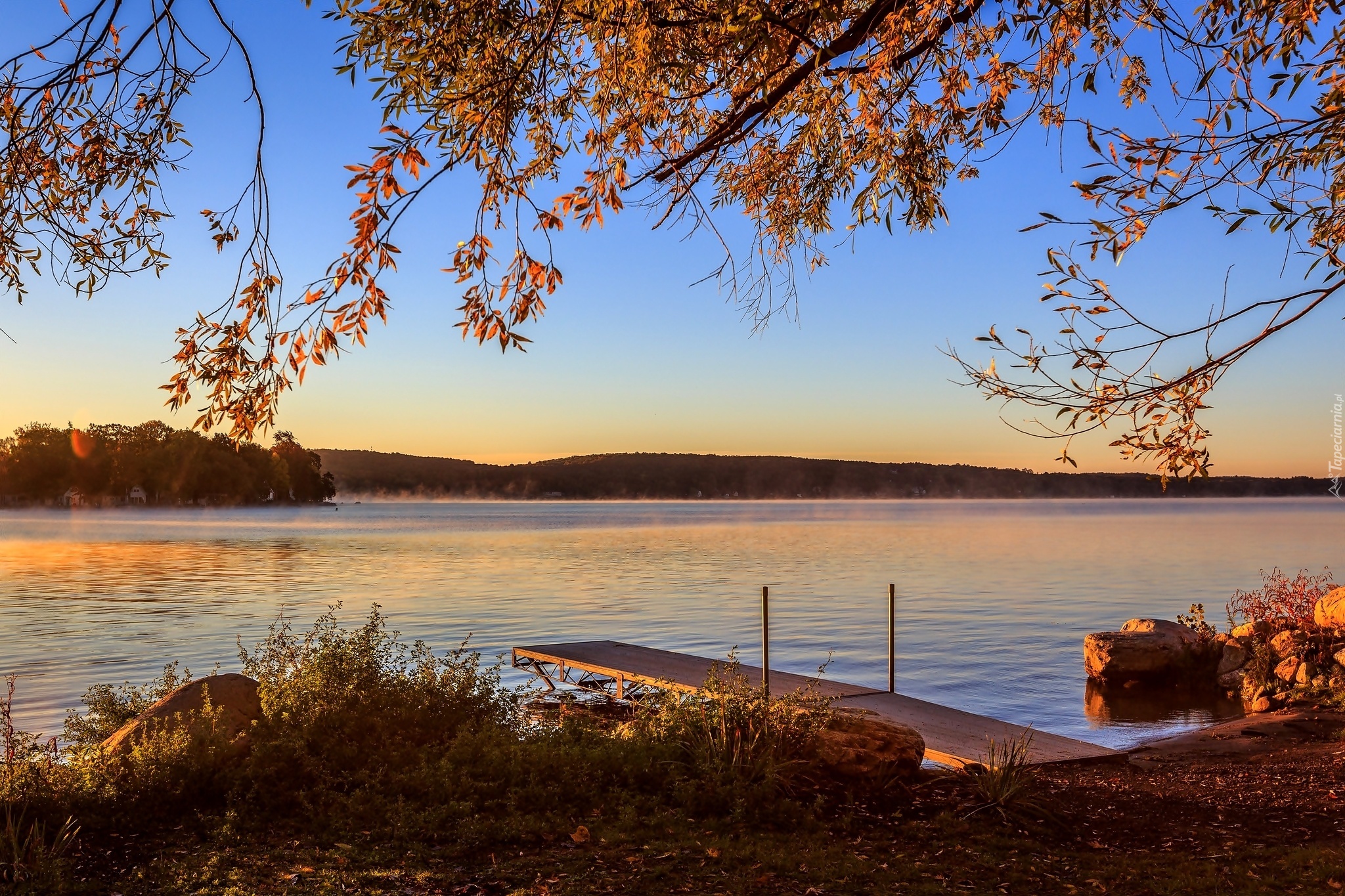 Edytor tapety: Jezioro, Pomost, Drzewo, Wschód, Słońca