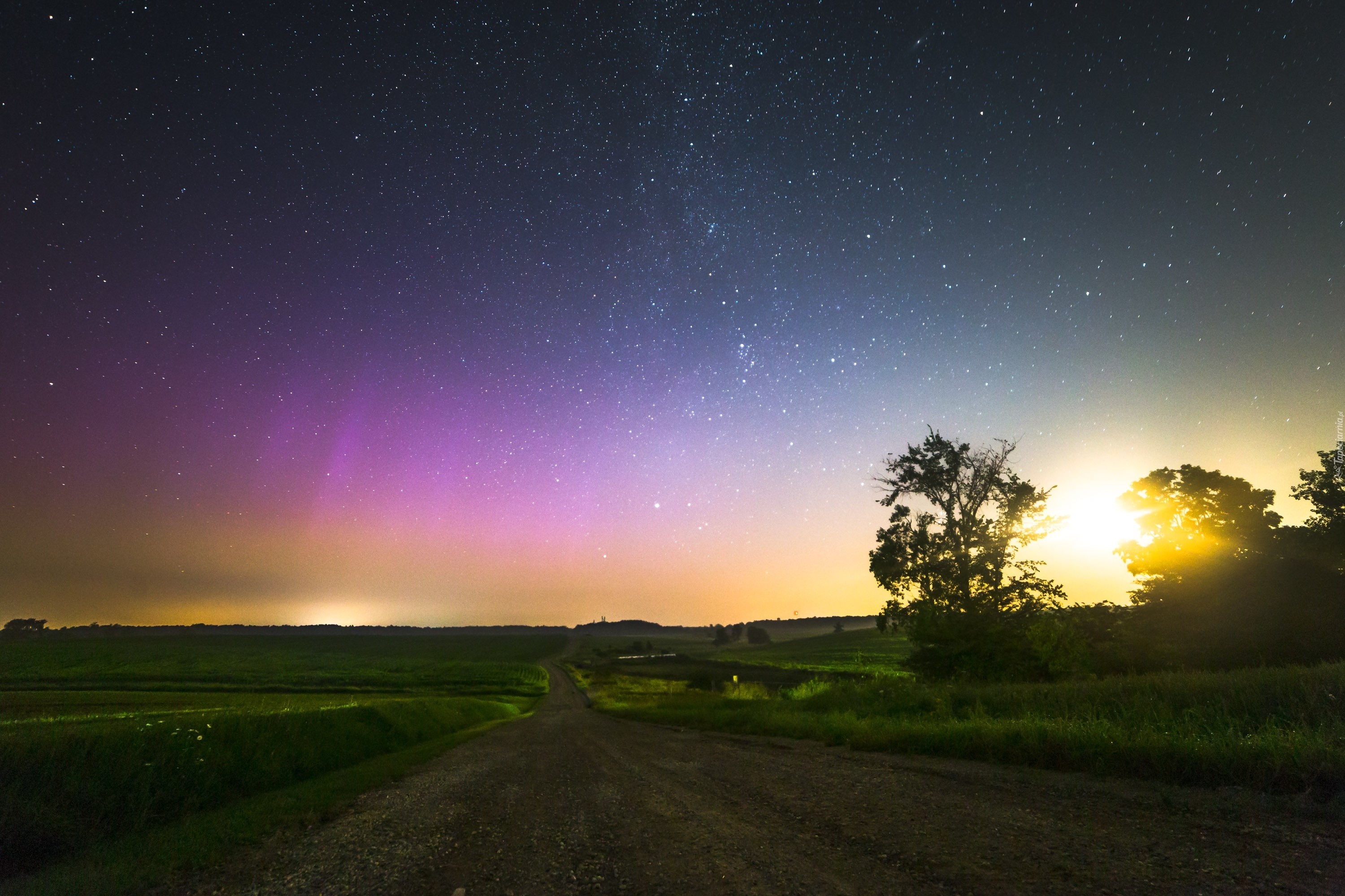 Edytor tapety: Zachód, Słońca, Droga, Pola, Drzewa